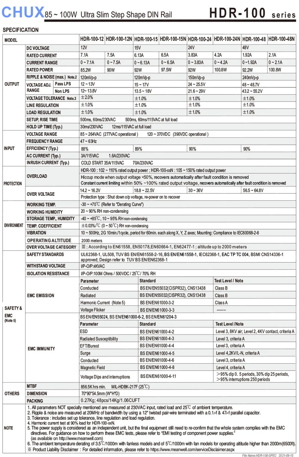 | Блок живлення на DIN-рейку 90W 24V HDR-100-24V, 100W @ 24V, CHUX Код товару: 214314