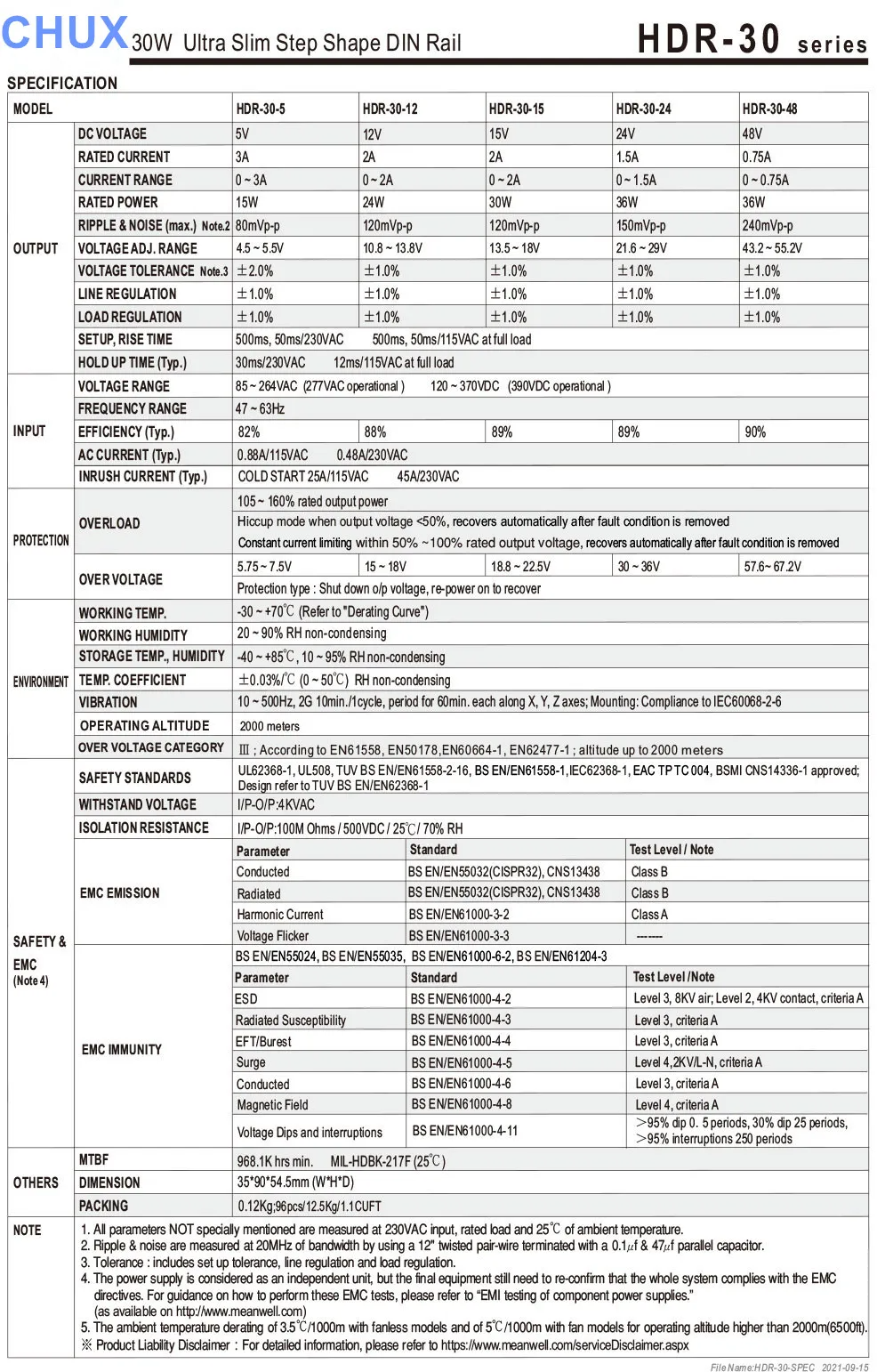 | Блок живлення на DIN-рейку 30W 24V HDR-30-24V, 30W @ 24V, CHUX Код товару: 214313