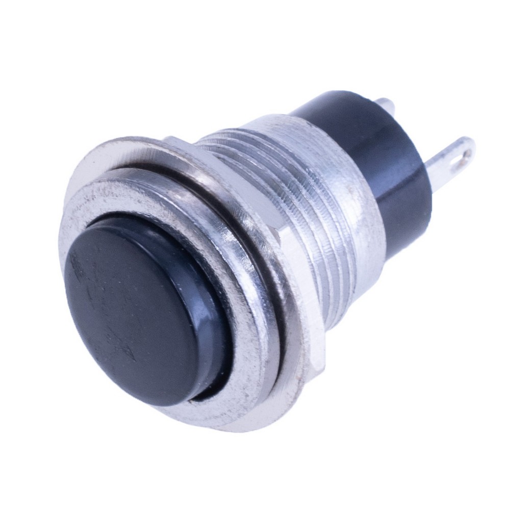 Опис: Кнопка без фіксації. Колір: чорний. 2 контакти.Напруга/струм: 125V/3A. Розмір монтажного отвору: 16мм.