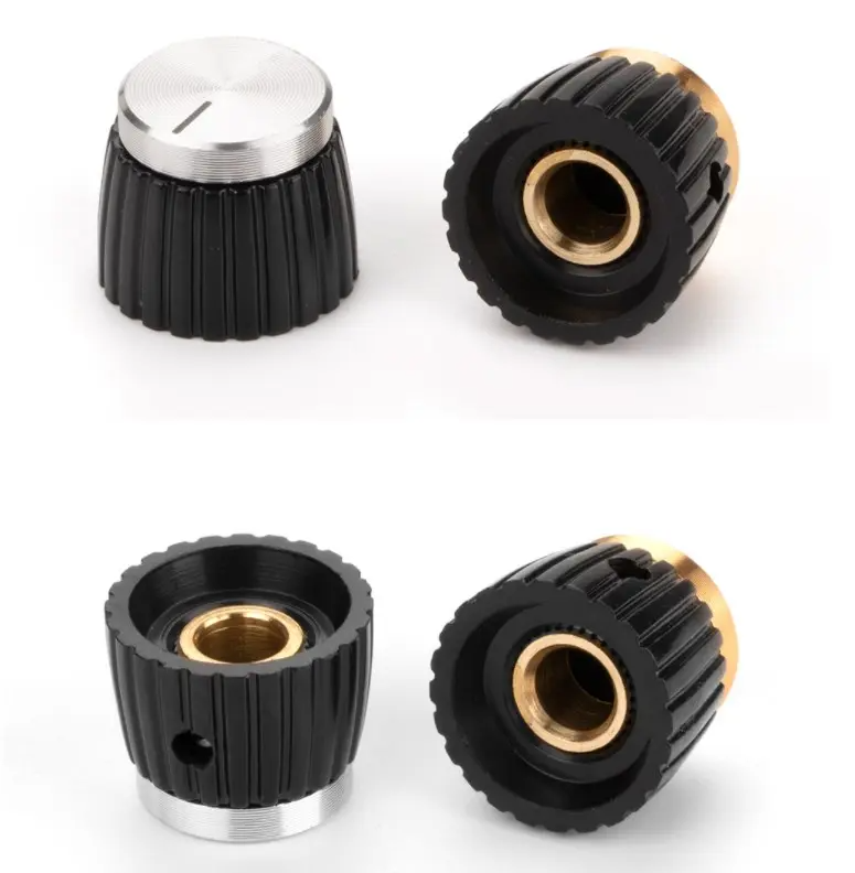 Опис: Ручка пластикова з алюмінієвою вставкою для потенціометра. Колір: золотий, смужка чорна, висота: 15,3мм, зовнішній діаметр: 19,7мм, внутрішній діаметр: 6,35мм. Монтаж на вісь: затискається гвинтом.