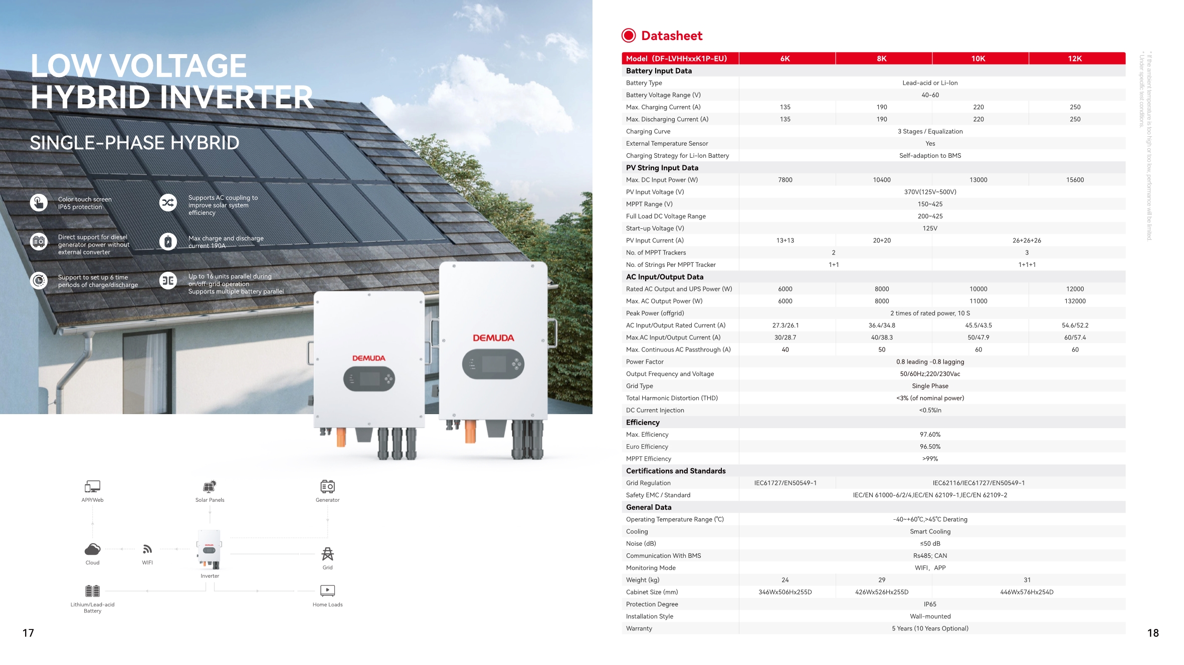 Опис: Гібридний однофазний низьковольтний інвертор. Номінальна потужність AC 12kW, вихід 220/230VAC 50/60Hz. Працює із АКБ Lead-acid або Li-ion 40…60V, макс. струм заряду/розряду 250A, PV вхід до 15600W, PV напруга 370V(125…500V), MPPT діапазон 150…425V, старт 125V, макс. струм PV 26+26+26A. 3 MPPT трекери, ККД до 97.6%, MPPT >99%, система розумного охолодження, шум ≤50dB, зв’язок з BMS RS485/CAN, моніторинг WiFi/APP, захист IP65, робоча температура -40…+60°C, настінний монтаж.
