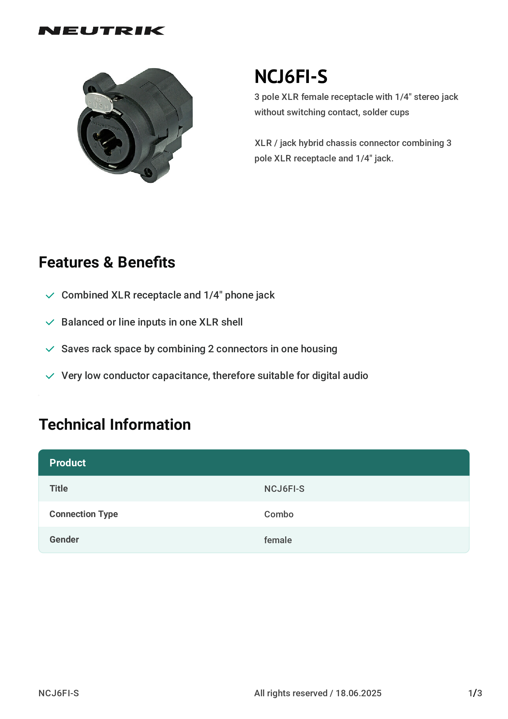 | NCJ6FI-S | Neutrik Americas, Inc. |