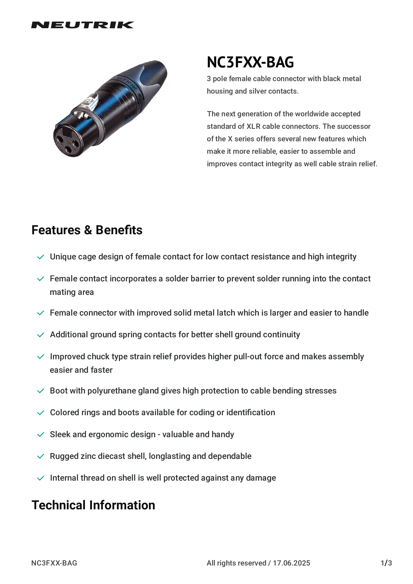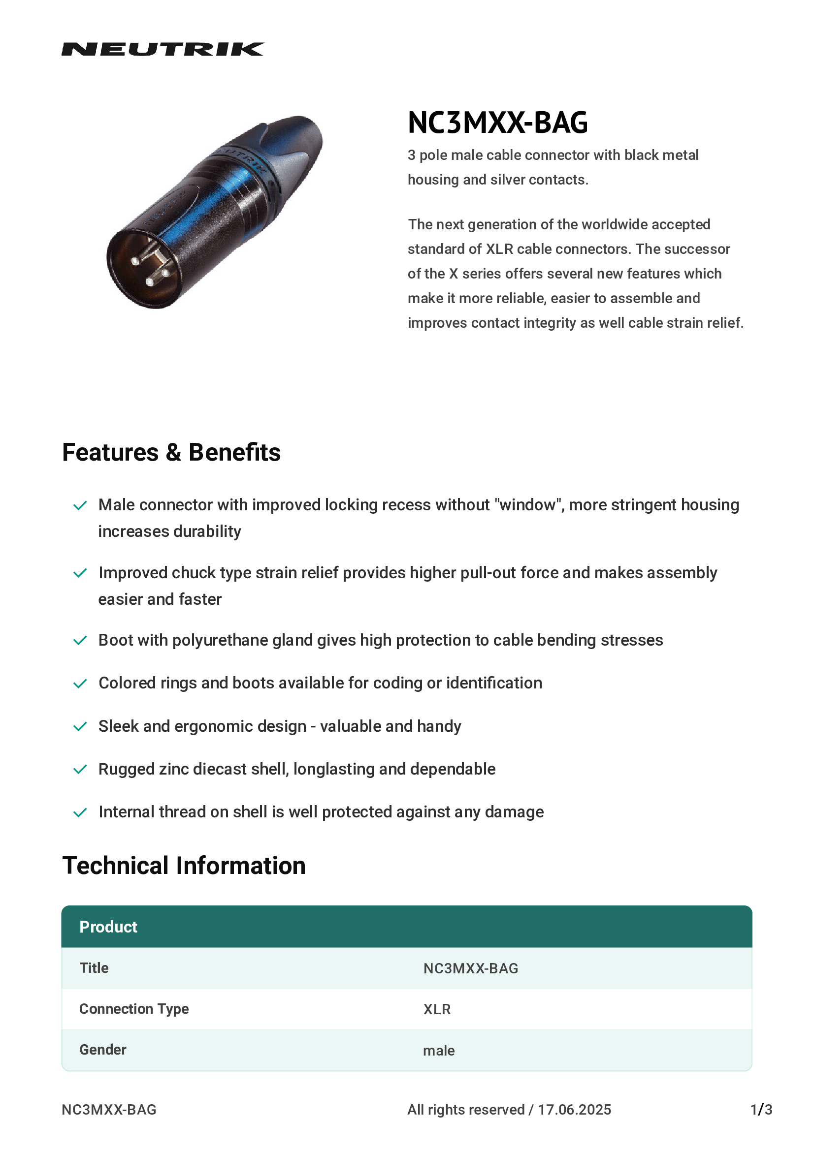 | NC3FXX-BAG | Neutrik Americas, Inc. |