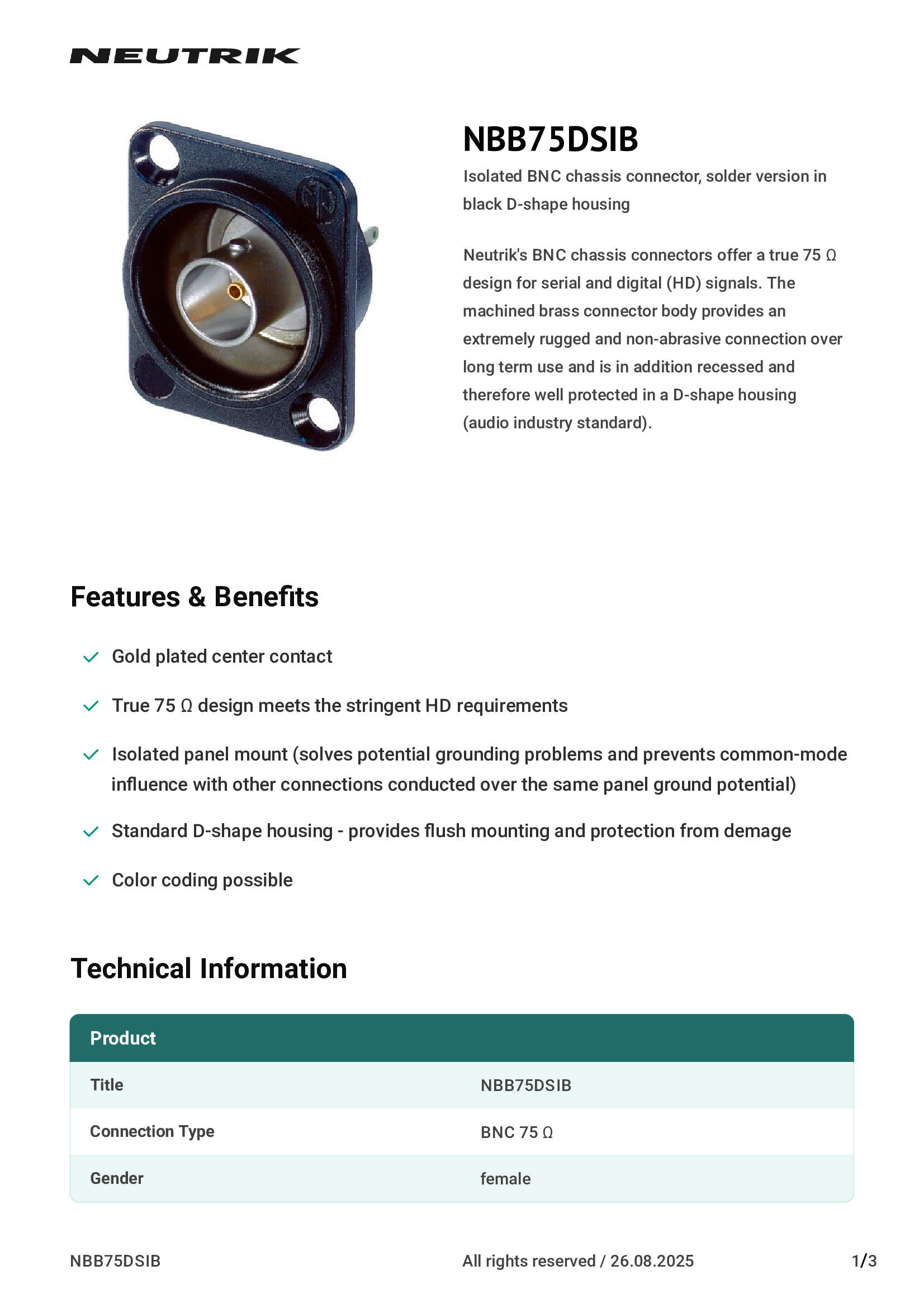 | NBB75DSIB | Neutrik Americas, Inc. |