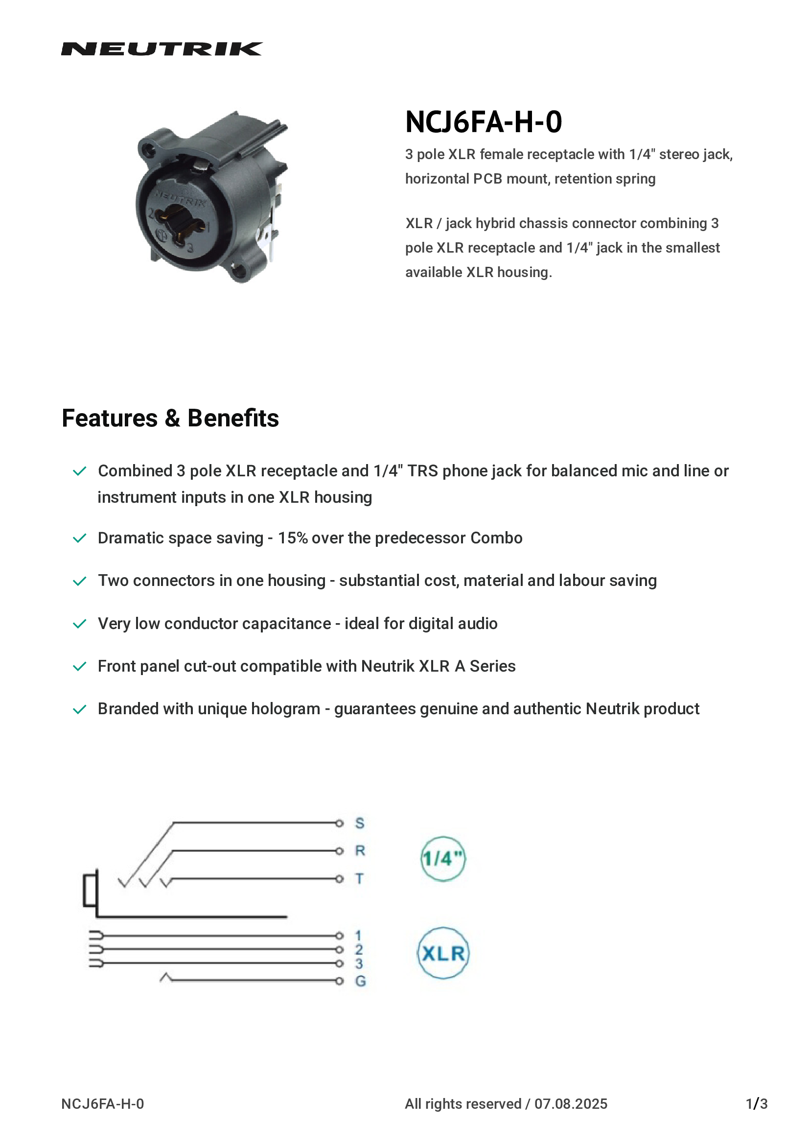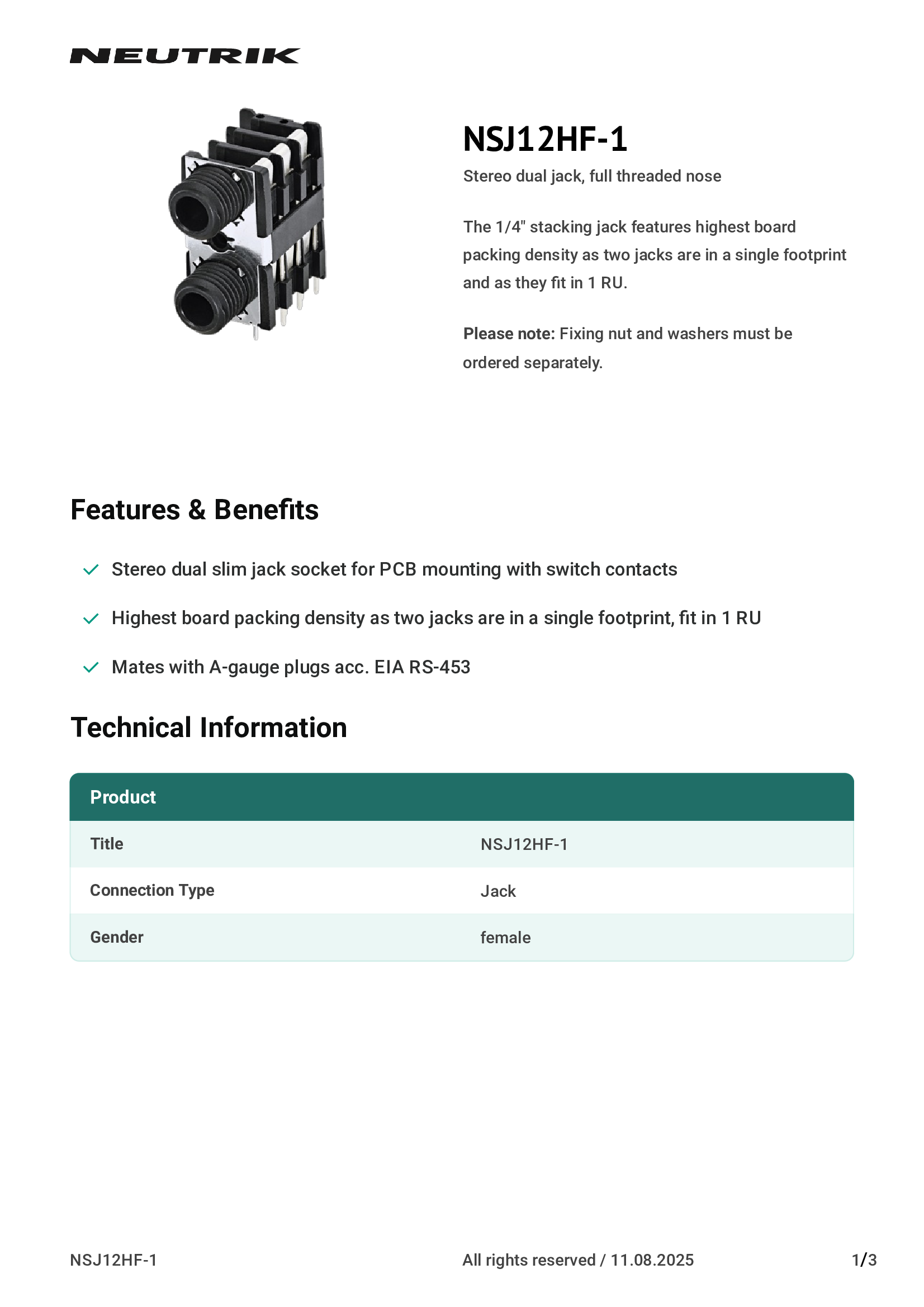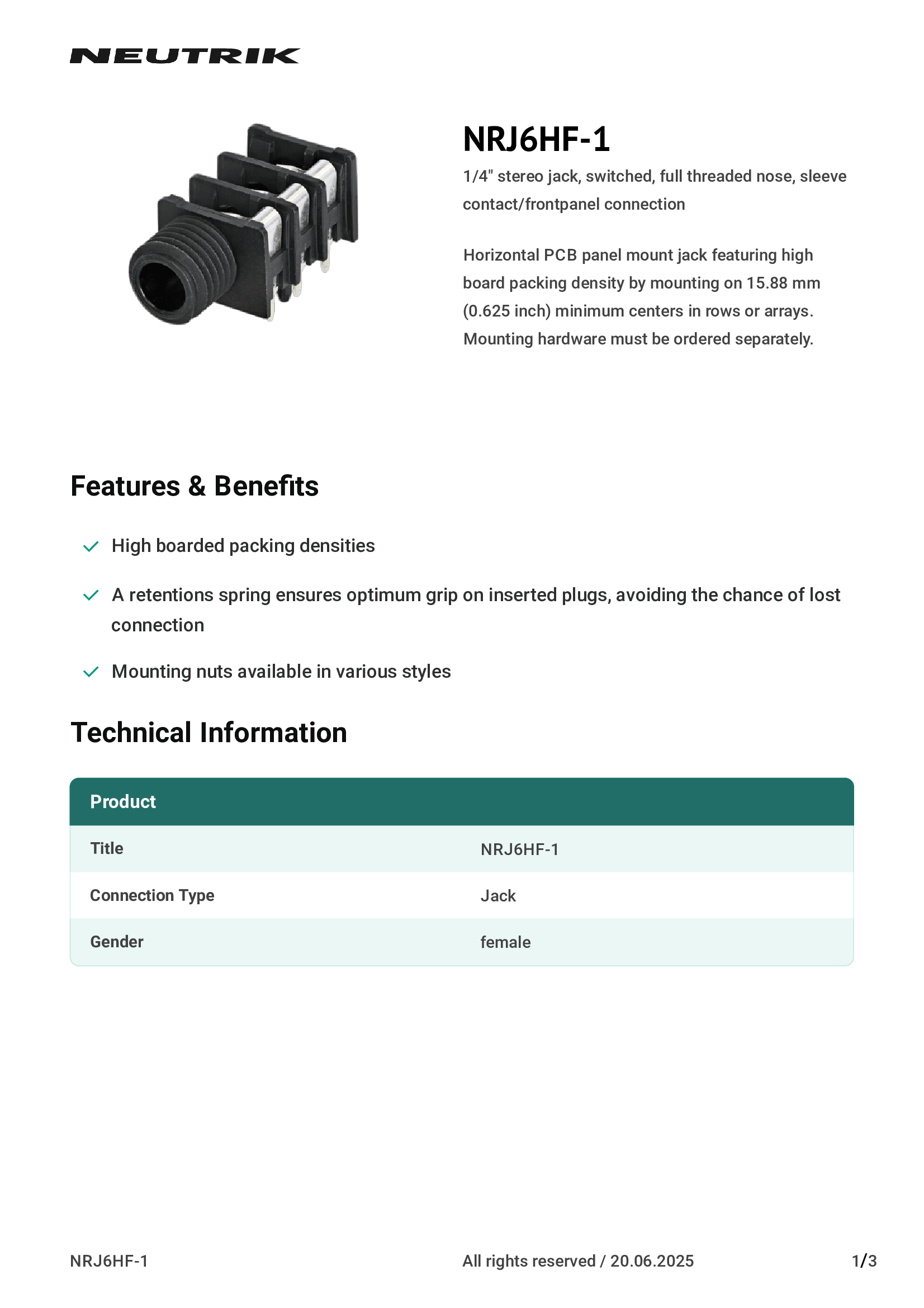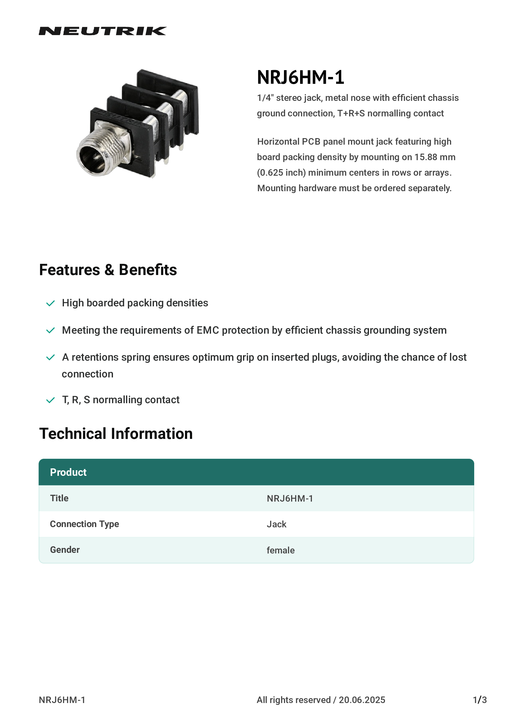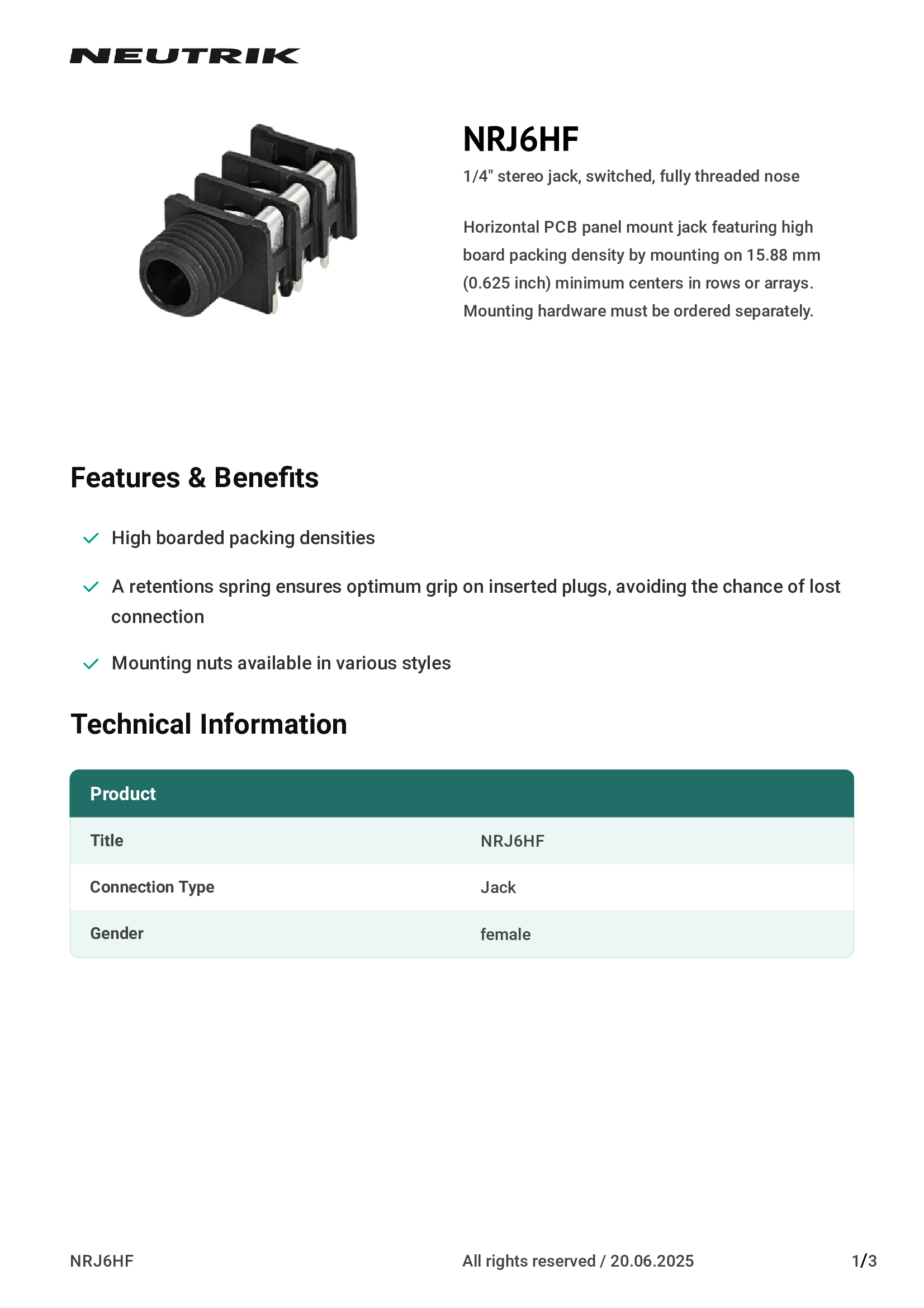 | NCJ6FA-H-0 | Neutrik Americas, Inc. |