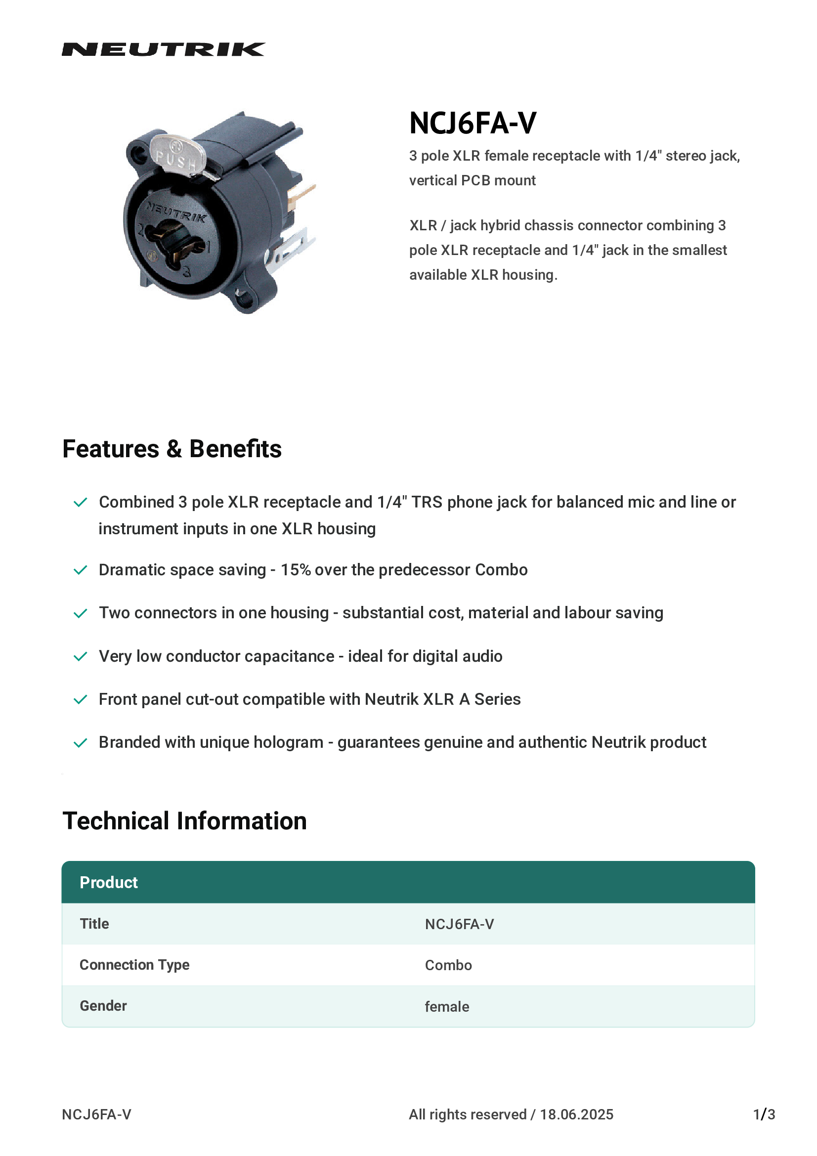 | NCJ6FA-V | Neutrik Americas, Inc. |