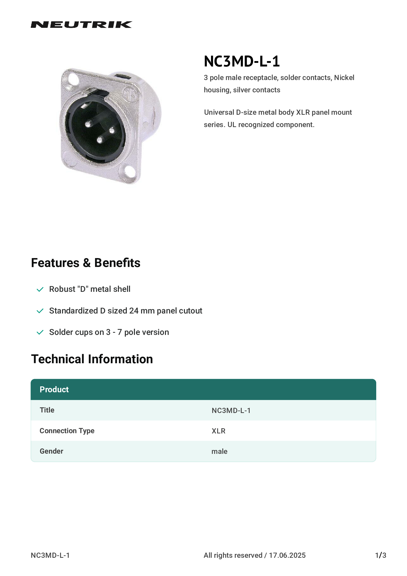 | NC3MD-L-1 | Neutrik Americas, Inc. |
