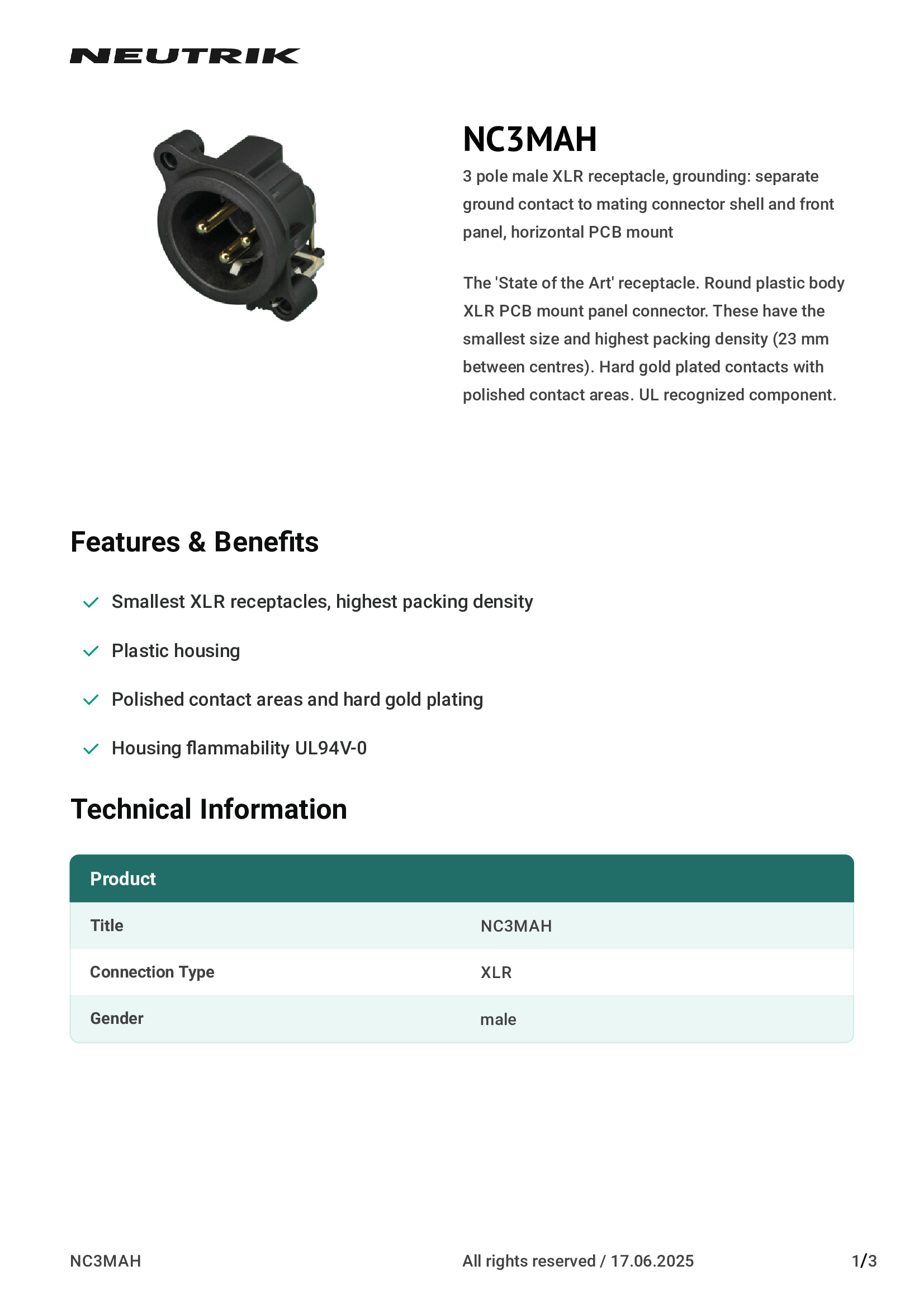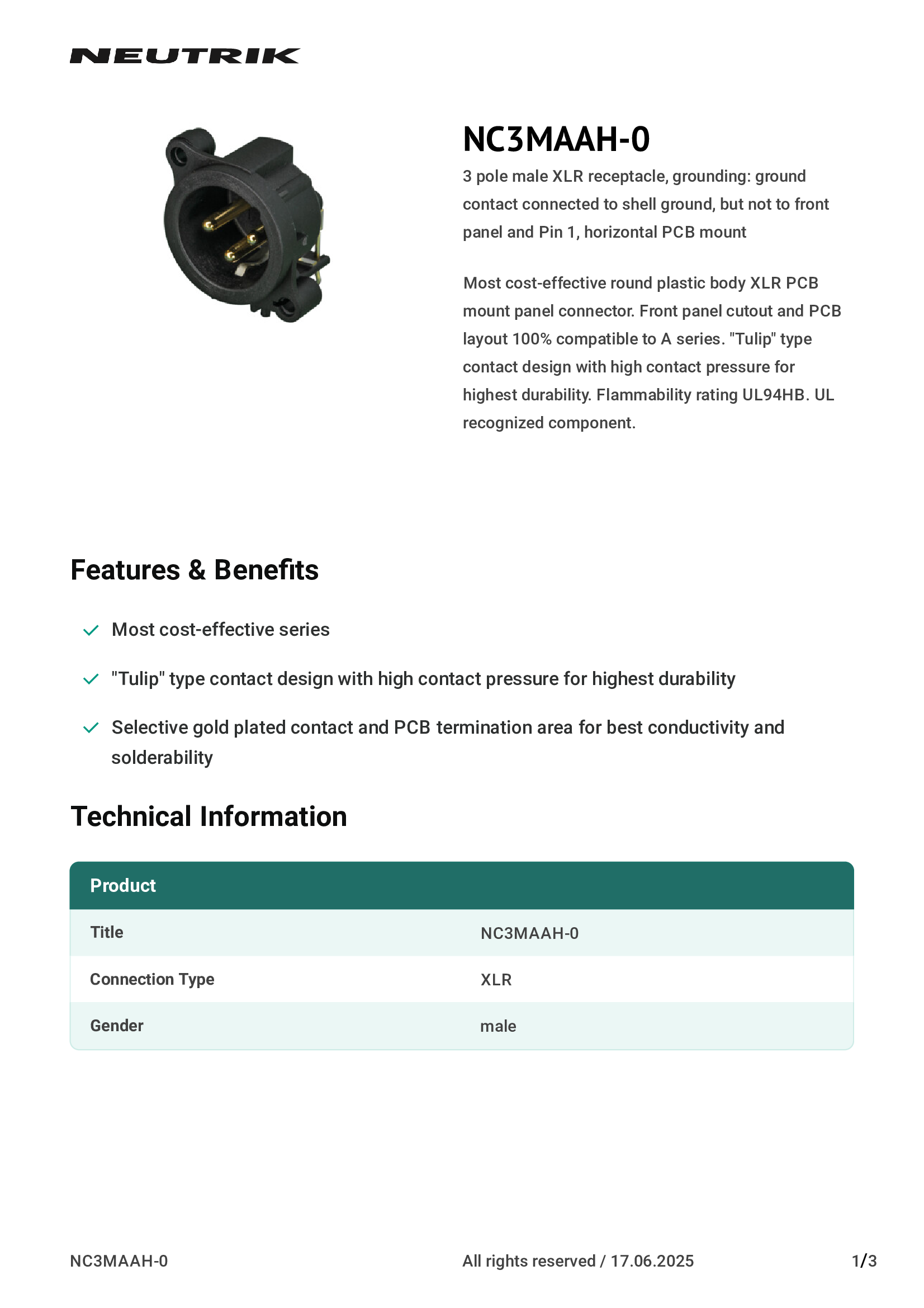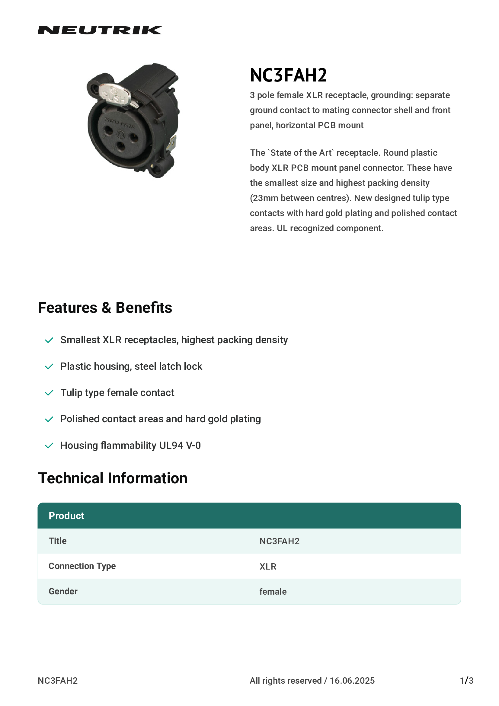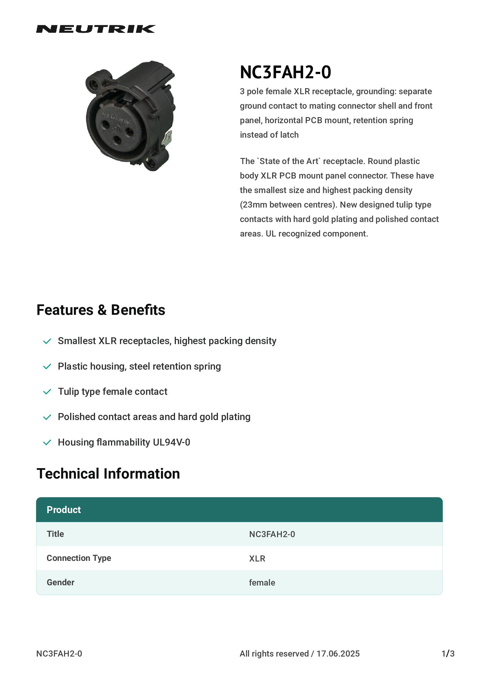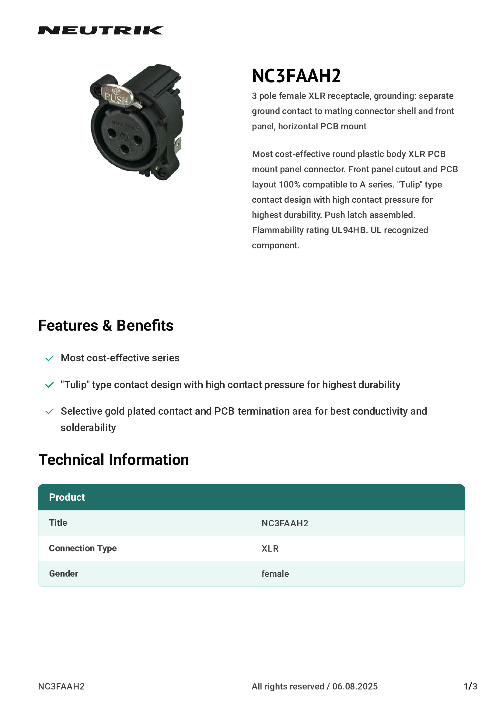| NC3FAAH2 | Neutrik Americas, Inc. |