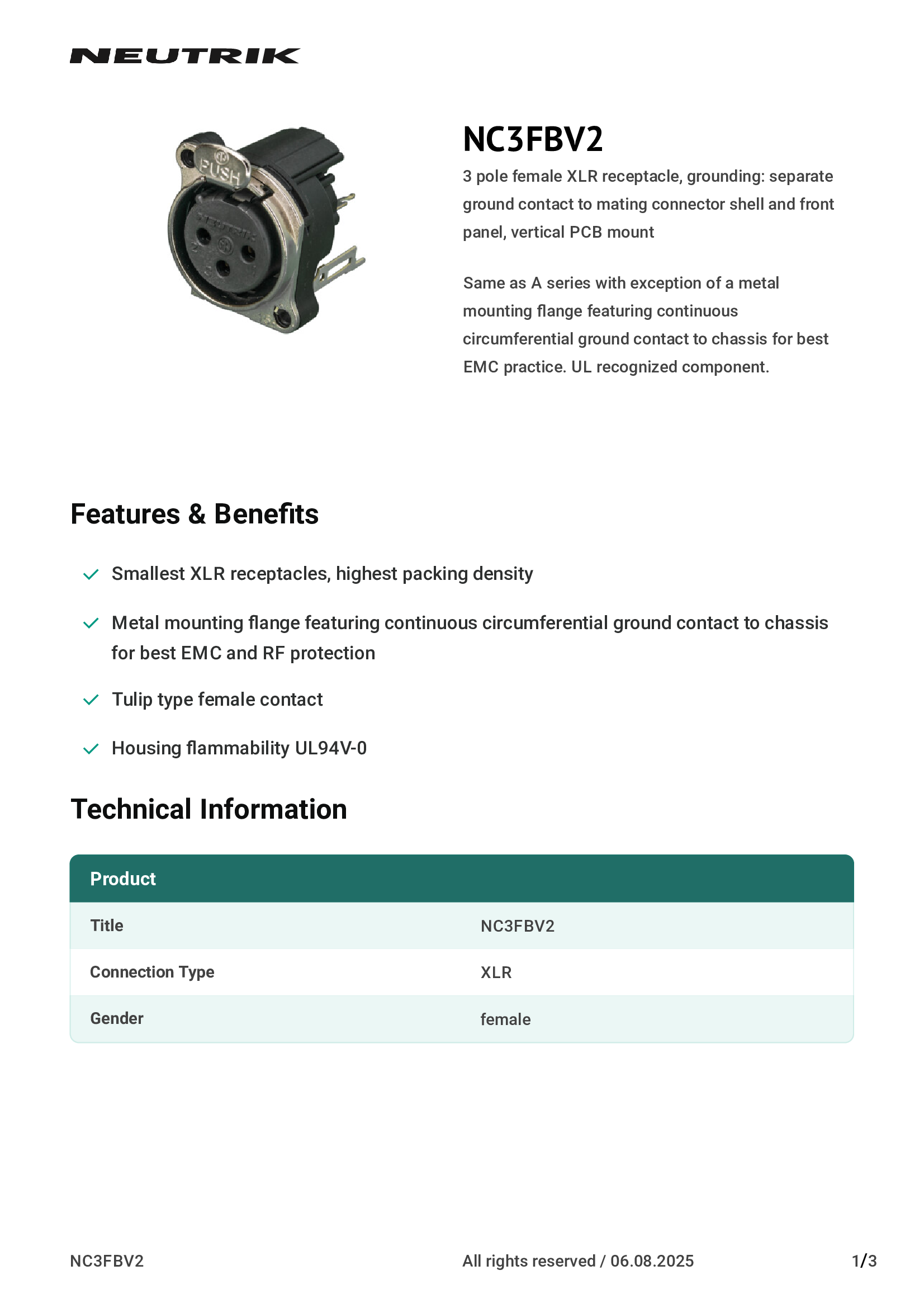 | NC3FBV2 | Neutrik Americas, Inc. |