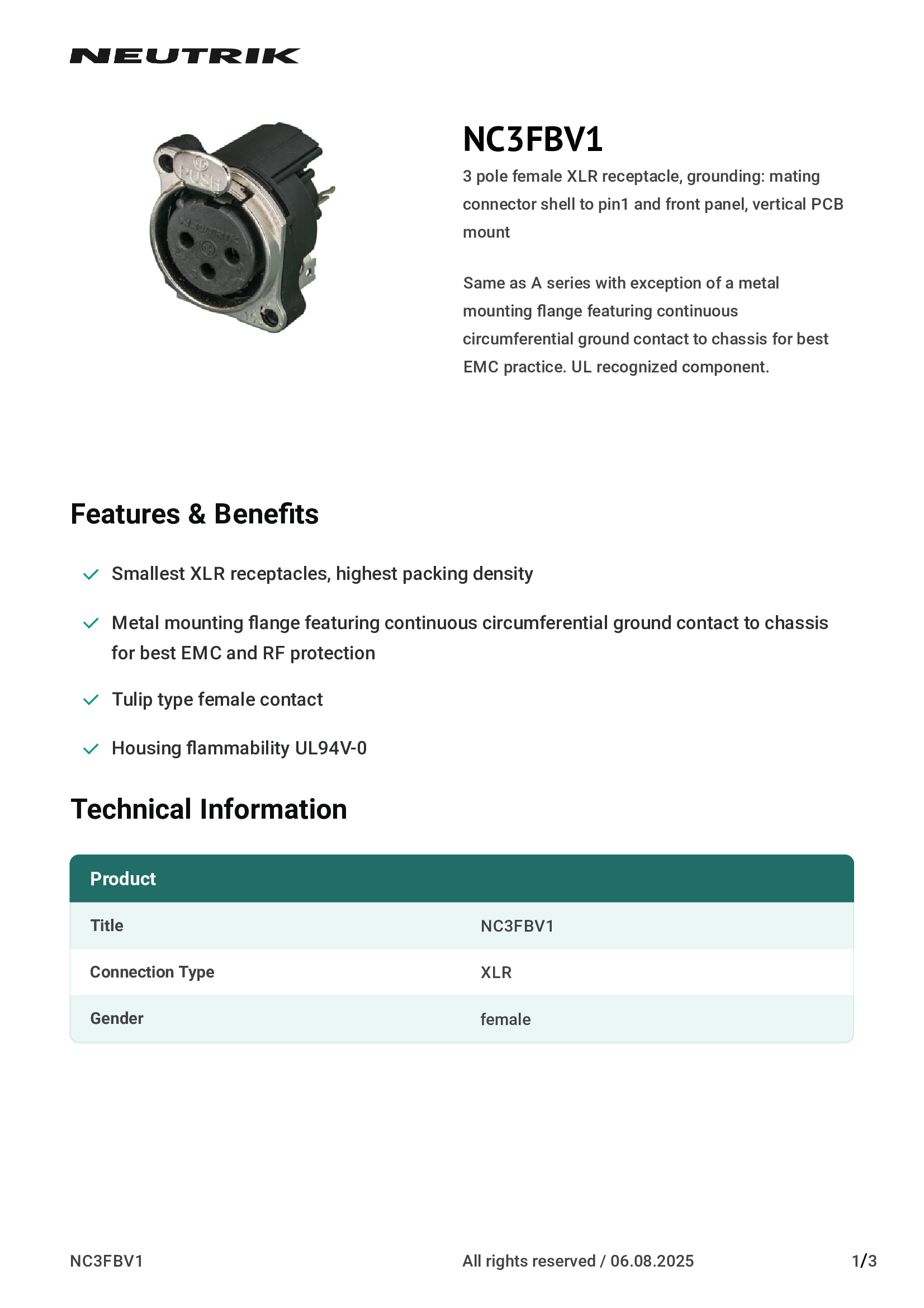 | NC3FBV1 | Neutrik Americas, Inc. |