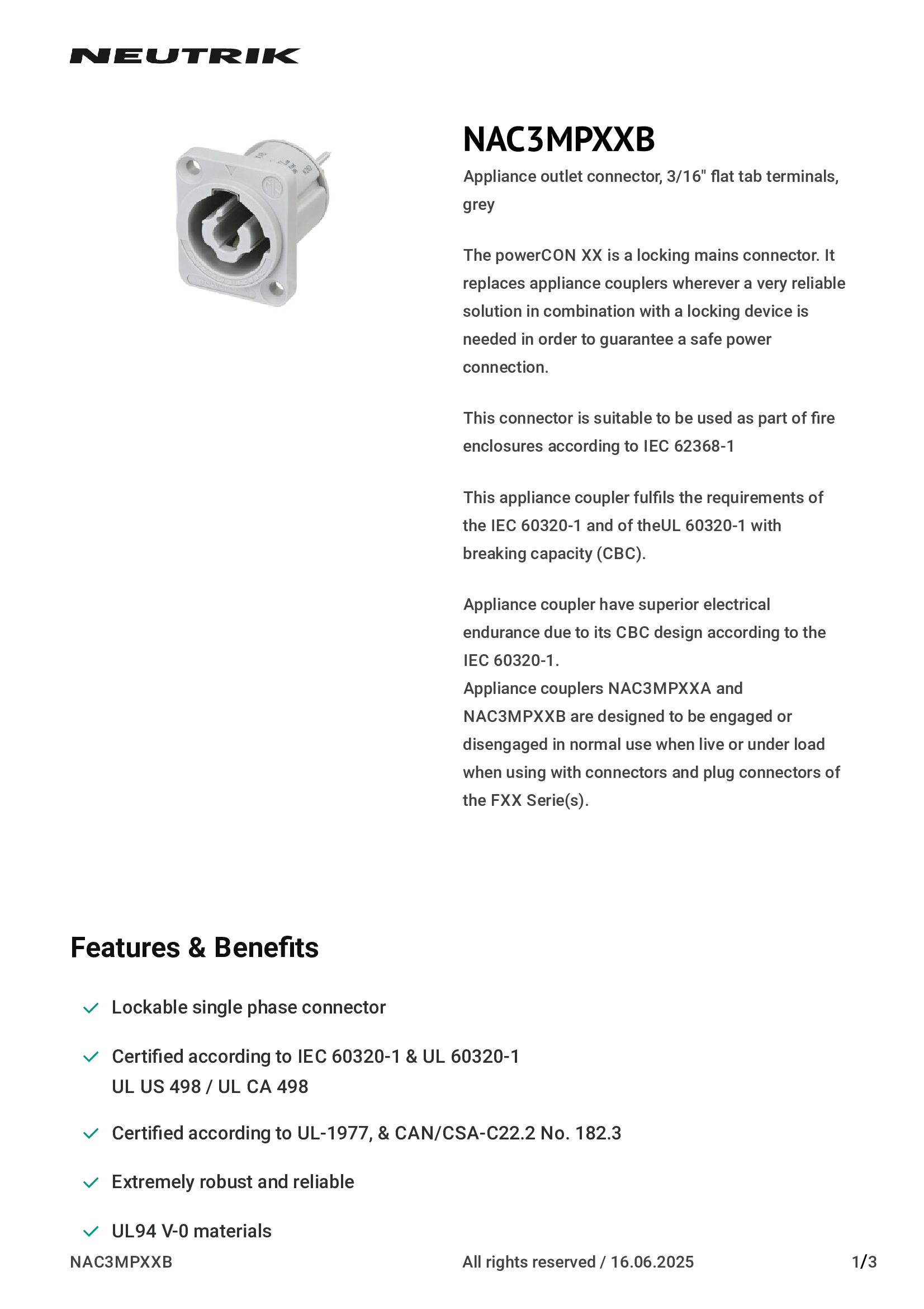 | NC3FD-L-1 | Neutrik Americas, Inc. |