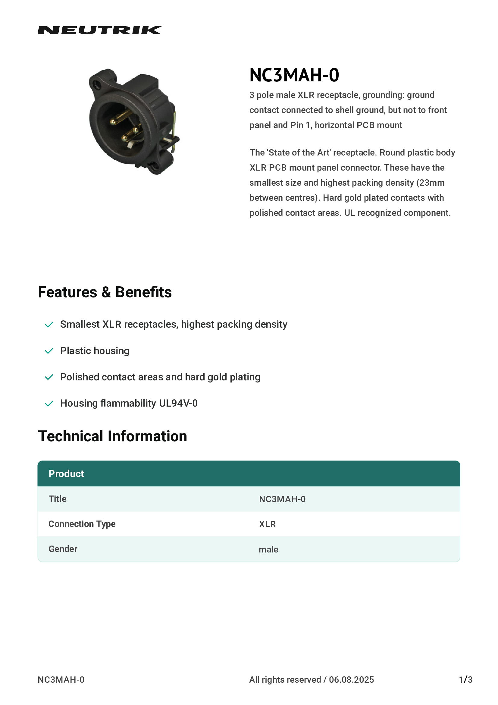 | NC3MAAH-0 | Neutrik Americas, Inc. |