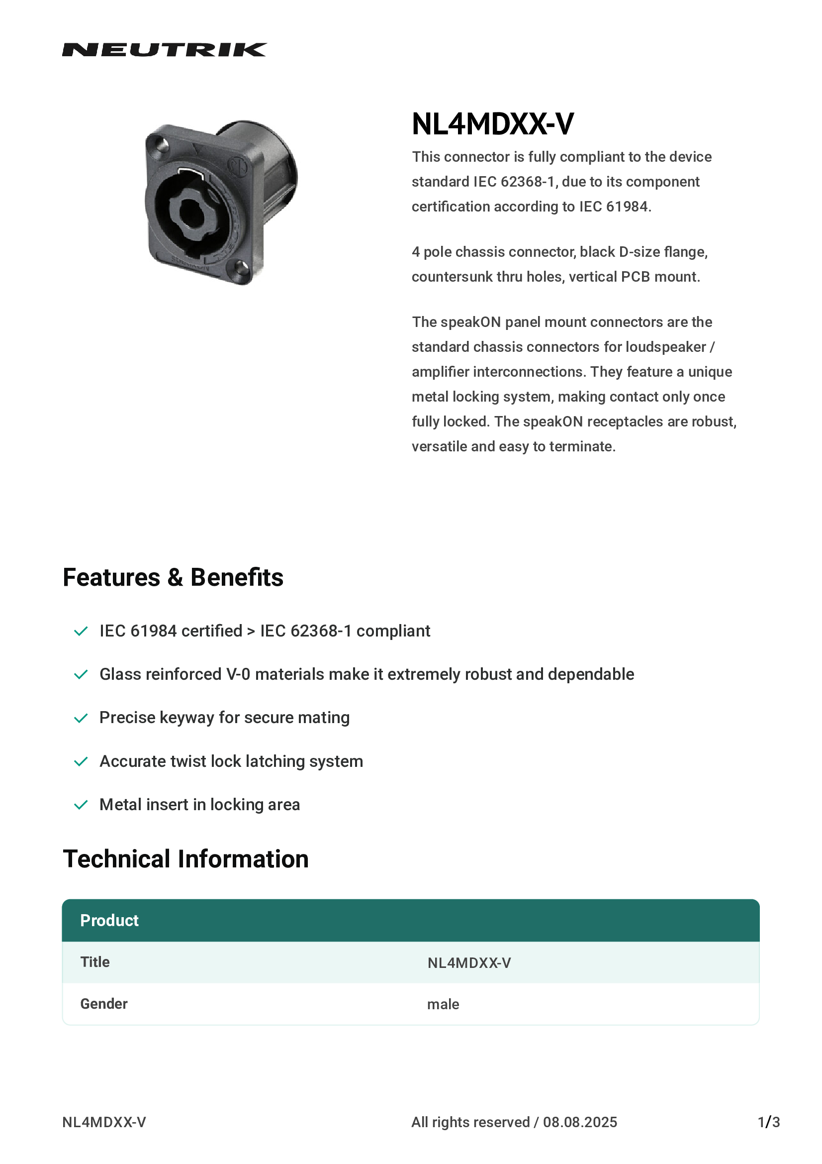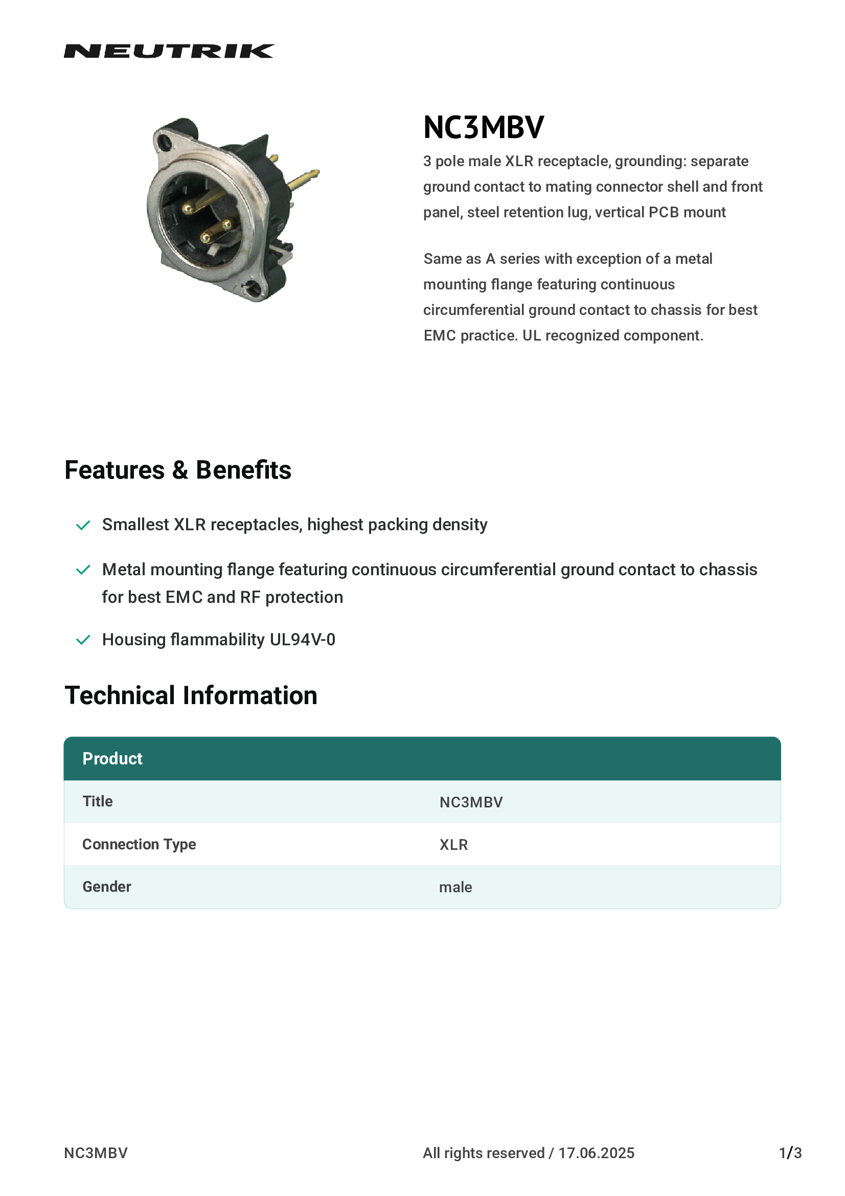 | NC3MBV | Neutrik Americas, Inc. |