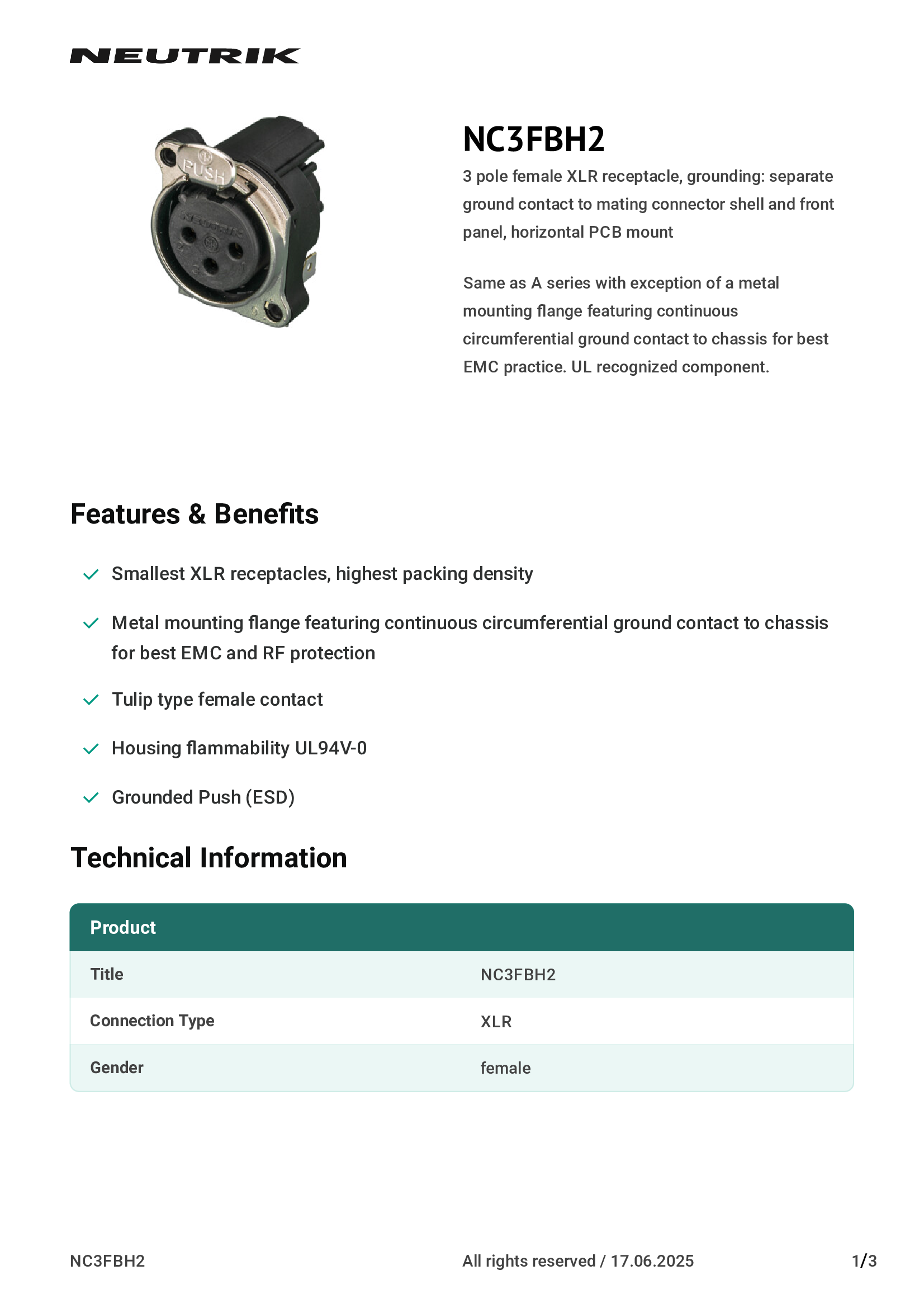 | NC3FBH2 | Neutrik Americas, Inc. |