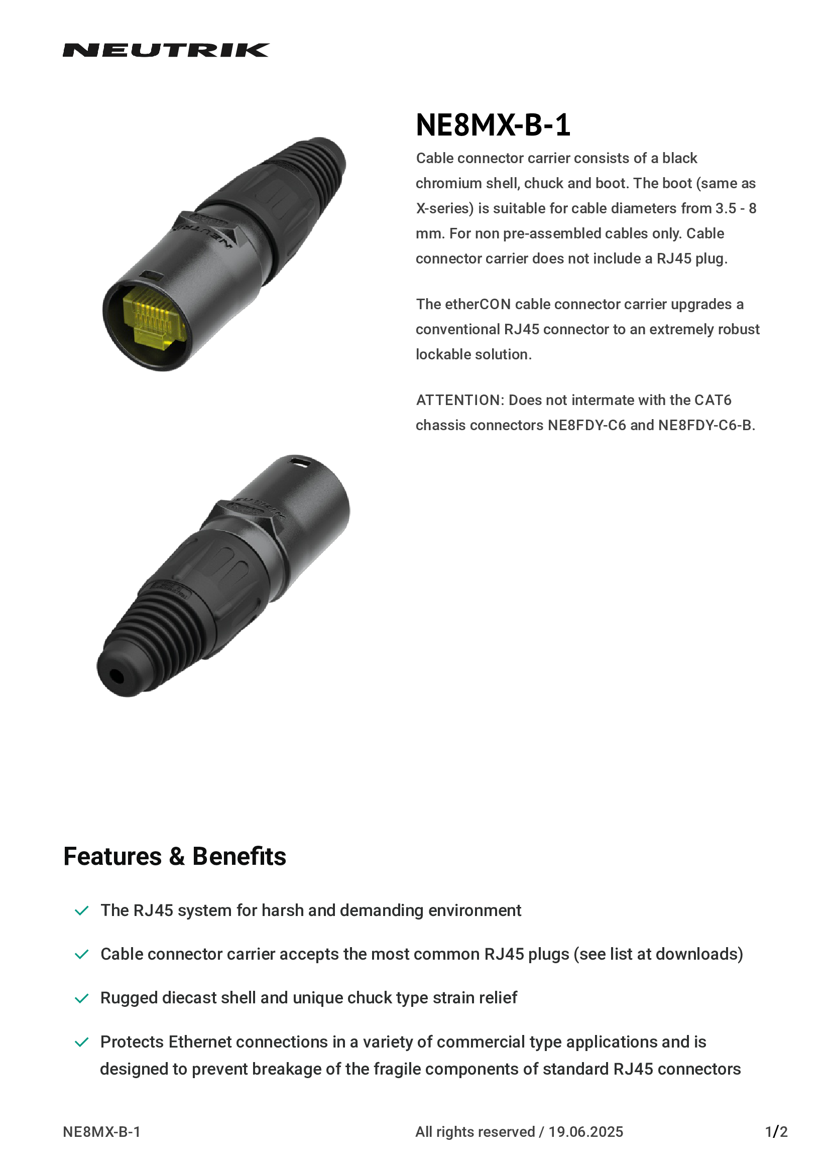 NE8MX-B-TOP | Neutrik | Ethernet Cables / Networking Cables CAT5 and CAT6A - black - requires RJ45, for unterminated cable - TOP |