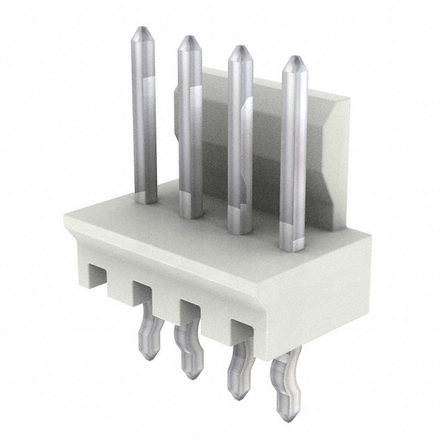 Description: CONN HEADER VERT 4POS 2.54MM, Packaging: Bulk, Connector Type: Header, Mounting Type: Through Hole, Number of Positions: 4, Number of Rows: 1, Style: Board to Board or Cable, Contact Type: Male Pin, Fastening Type: Friction Lock, Number of Positions Loaded: All, Termination: Kinked Pin, Solder, Material Flammability Rating: UL94 V-0, Contact Material: Brass, Insulation Color: Natural, Pitch - Mating: 0.100" (2.54mm), Contact Finish - Mating: Tin, Contact Finish Thickness - Mating: 60.0µin (1.52µm), Contact Finish - Post: Tin, Contact Shape: Square, Contact Length - Post: 0.140" (3.56mm), Insulation Height: 0.322" (8.18mm), Shrouding: Shrouded - 1 Wall, Overall Contact Length: 0.560" (14.22mm), Insulation Material: Polyester, Glass Filled, Contact Length - Mating: 0.295" (7.49mm).