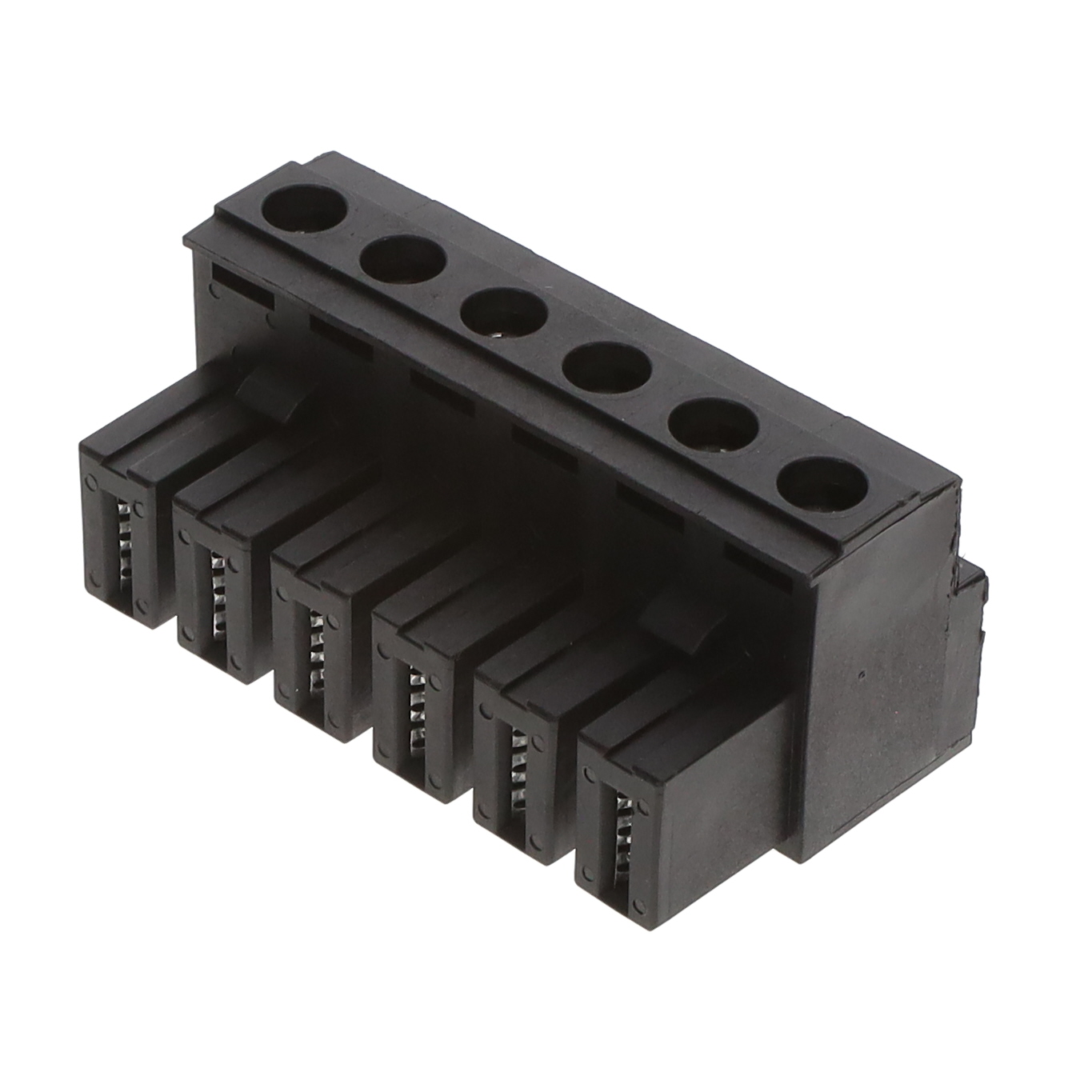 Description: TERM BLOCK PLUG 6POS STR 12MM, Features: Retention Latches (Non-Wire Side), Packaging: Bulk, Color: Black, Mounting Type: Free Hanging (In-Line), Number of Positions: 6, Pitch: 0.472" (12.00mm), Type: Plug, Female Sockets, Operating Temperature: 130°C, Termination Style: Screw - Rising Cage Clamp, Number of Levels: 1, Wire Gauge or Range - AWG: 3-14 AWG, Positions Per Level: 6, Plug Wire Entry: 180°, Contact Mating Finish: Tin, Current - UL: 85 A, Voltage - UL: 600 V.