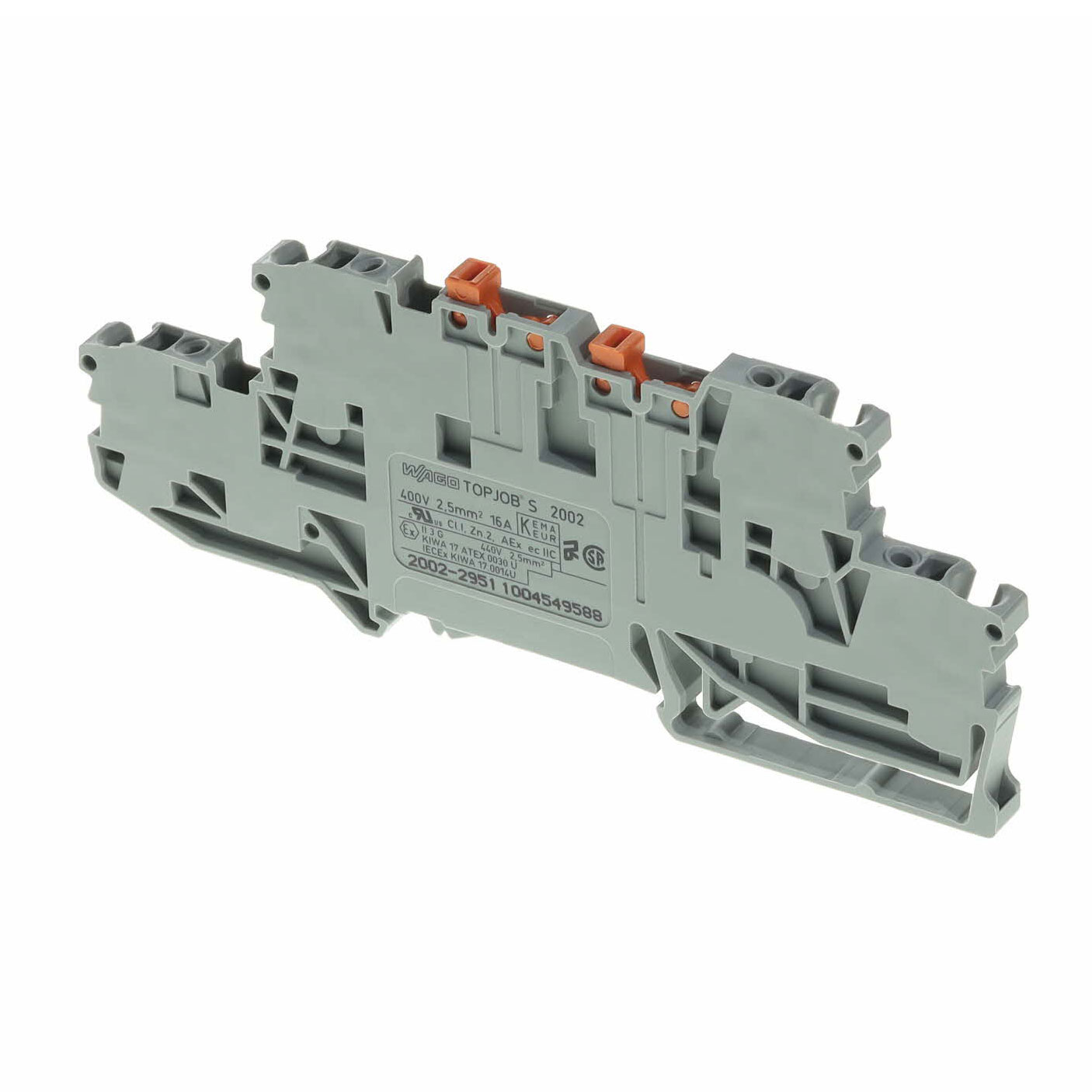 Description: WAGO - 2002-2951 - Reihenklemme zur DIN-Schienenmontage, 4 -polig, 22 AWG, 12 AWG, 2.5 mm², Steckanschluss, 16 A, tariffCode: 85369010, rohsCompliant: YES, Nennspannung: 400V, hazardous: false, rohsPhthalatesCompliant: YES, Nennstrom: 16A, usEccn: EAR99, Drahtanschlussverfahren: Steckanschluss, Anzahl der Ebenen: 2, Anzahl der Positionen: 4-polig, Leiterstärke (AWG), max.: 12AWG, Leiterquerschnitt CSA: 2.5mm², euEccn: NLR, Leiterstärke (AWG), min.: 22AWG, Produktpalette: TOPJOB S 2002 Series, productTraceability: No, SVHC: No SVHC (21-Jan-2025).