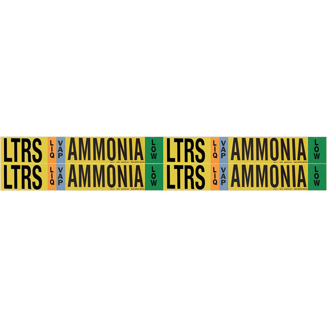 Description: AMMONIA (IIAR) PIPE MARKERS, Features: Abrasion Resistant, Chemical Resistant, Weather Resistant, Packaging: Bulk, Mounting Type: Adhesive, Length: 7.000" (177.80mm), Shape: Rectangle, Width: 1.125" (28.58mm), Material - Body: Vinyl, Applications: Pipe, Color - Background: Yellow, Location: Outdoor, Language: English, Application Specifics: Combustible Fluids, Arrangement: Text Only, Legend (Text): LTRS Ammonia, Legend (Symbol Only): No Symbol, Color - Legend: Black, Blue, Green, Orange, Outside Pipe Diameter (Min): 2.375" (60.33mm), Outside Pipe Diameter (Max): 0.750" (19.05mm) 3/4", Print Type: Pre-Printed.