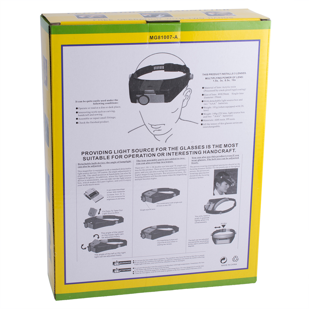 Опис: Лупа бінокулярна з кріпленням на голову з LED підсвічуванням та додатковою рухомою лінзою, лінзи акрилові: 1,5x, 3x, 8,5x, 10x. Живлення від двох батарей ААА.