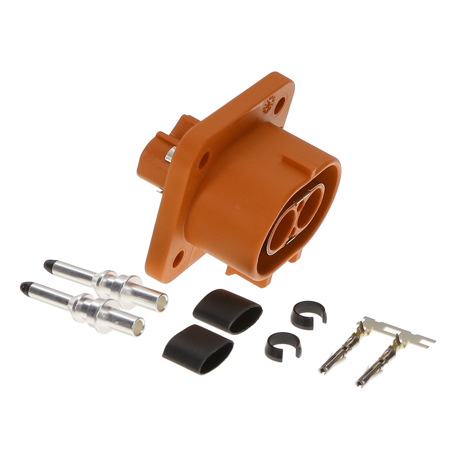 Description: E-POWER LITE, Features: Connector Position Assurance (CPA), Shielded, Waterproof (Mated, IP67), Packaging: Bag, Connector Type: Receptacle, Color: Orange, Mounting Type: Free Hanging (In-Line), Wire Gauge: 12 AWG, Number of Positions: 2, Contact Type: Male Pin, Fastening Type: Locking Ramp, Wire Type: Discrete, Cable Termination: Crimp, Number of Rows: 1.