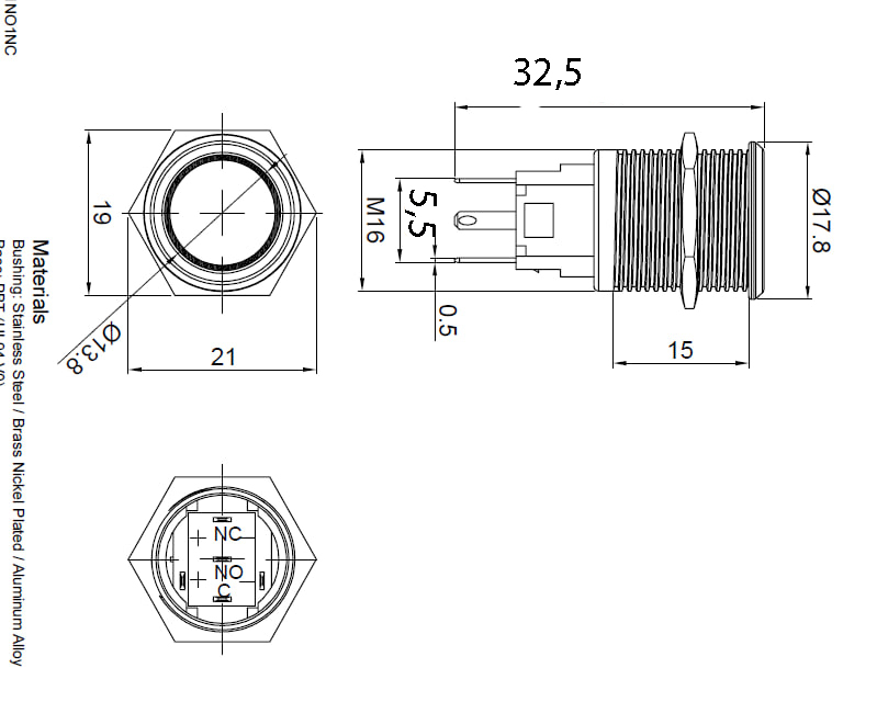Опис: Кнопка антивандальна з фіксацією. Підсвічування: зелене, живлення 12VDC. Комутуюча напруга струм: 250V/3A. Тип контактів: SPST-NO. Ступінь захисту: IP65. Діаметр монтажного отвору: 16.3mm.