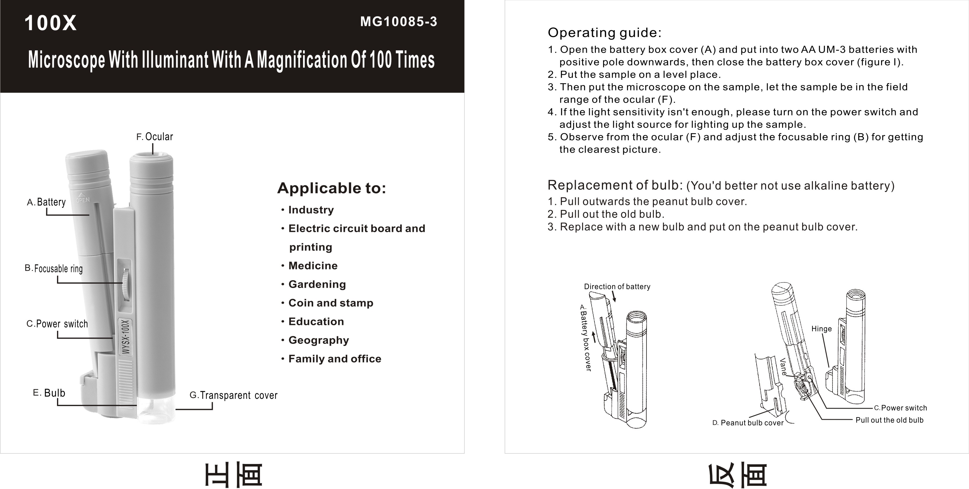 Опис: Портативний мікроскоп для читання та огляду з кратністю збільшення 100X. Призначений для промислових робіт, електроніки, медицини, садівництва, нумізматики та побутового використання. Оснащений регульованим фокусувальним кільцем та LED-підсвіткою, що забезпечує чітке спостереження дрібних деталей у межах поля зору до 4mm. Живлення 2xAA.