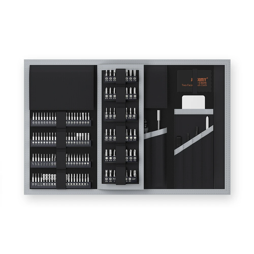 Опис: Набір інструментів Jakemy YF-P13 складається з 201 предмета і включає в себе дві рукоятки викрутки з антиковзним покриттям. Два подовжувача (жорсткий і гнучкий для роботи в важкодоступних місцях), намагнічувач. Антистатичний кутовий пінцет. Компактна щітка з антистатичним ворсом. Магнітний килимок. Серветку з мікрофібри. Двосторонню металеву лопатку. Пластикові медіатори та вакуумну присоску. Пластикові важелі (для відкриття корпусу). Набір 174 шт. насадок різного формату з матеріалу S2 та CR-V.