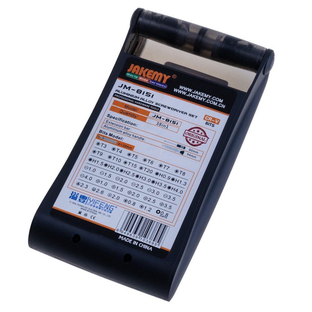 Виробник: JakemyОпис: Багатофункціональний набір прецизійних викруток та аксесуарів 54 в 1. Набір викруток JM-8151. Біти: Hex: H0.9, H1.3, H1.5, H2.0, H2.5, H3.0, H3.5, H4.0. Torx: T3, T4, T5, T6, T7, T8, T9, T10, T15, T20. Плоскі (Slotted): 1.0, 1.5, 2.0, 2.5, 3.0, 3.5, 4.0. Phillips: 1.0, 1.5, 2.0, 2.5, 3.5. Pentable: 0.8, 1.2. U-shaped: U2.6. Triangle: 2.3. Tri-wing: Y2.0. SIM PIN: 0.8. Подовжувач 60мм. Викрутки*5, пластикові трикутники для відкриття*2. Пластикові піки для відкриття*2. Скребок. Антистатичний пінцет. Роликовий інструмент для відкриття. Антистатичний браслет. Серветка для очищення. Стираємий маркер. Присоска. Магнітний килимок. Металевий спуджер. Габарити: 222x138x70mm.