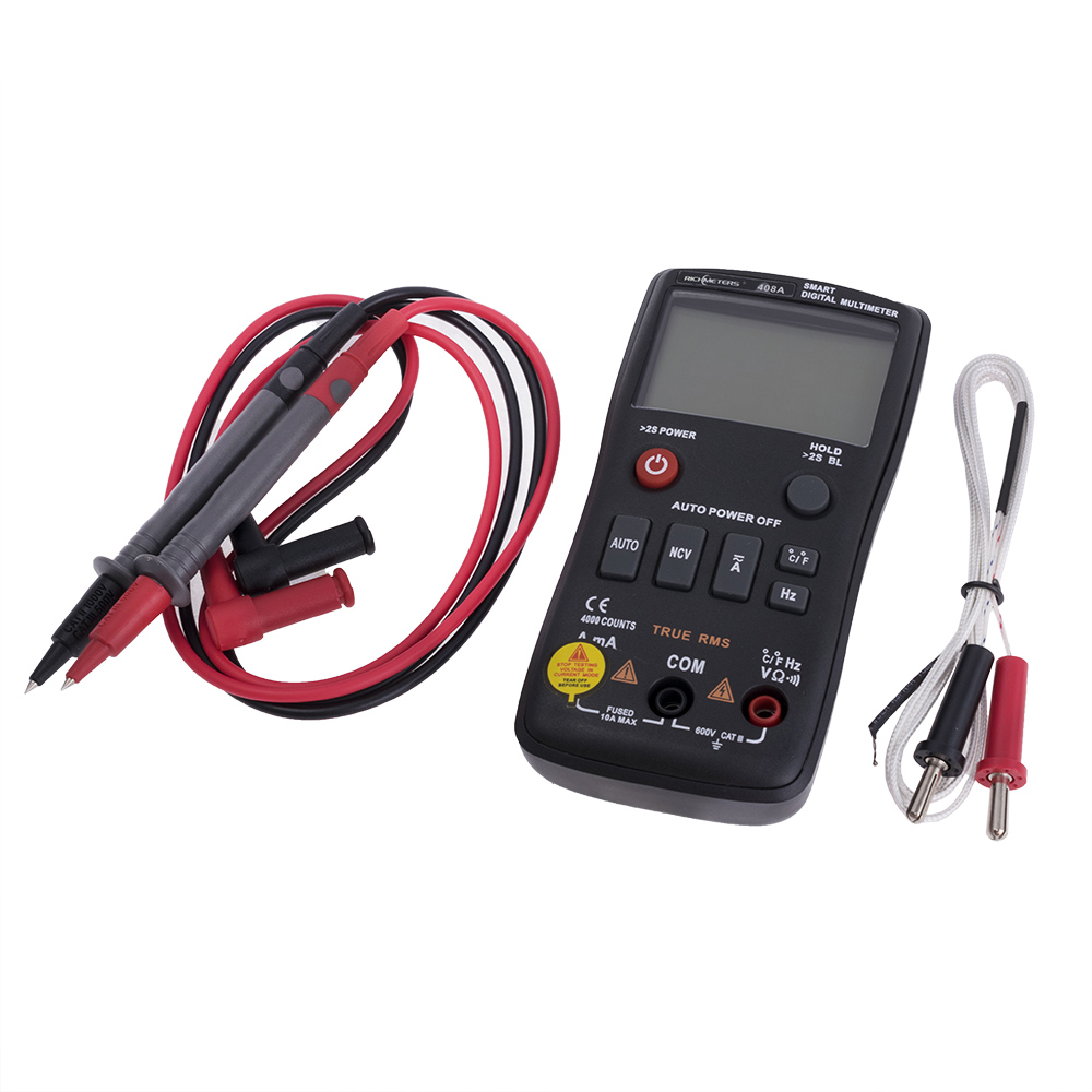 Опис: Цифровий мультиметр True RMS c NCV. Розрядність шкали мультиметра: 4000 відліків. Постійна напруга: 4V / 40V / 400V / 600V: ± 0.5% + 3, змінна напруга: 4V / 40V / 400V / 600V: ± 1% + 3, постійний струм: 999,1mA / 10A: ± 1% + 4, зміннийструм: 999,9mA / 10A: ± 2% + 3, опір: 4K: ± 1.5% / 40K / 400K / 4M: ± 0.5% / 40M: ± 1.5, вимір частоти AC: 40Hz-1kHz. Температура: -50 ... + 400 ° C (TP-01A). Автоматичний вибір діапазону. Прозвонка з'єднань, підсвічування, діодний тест, утримання даних. Живлення: 2xAAA. Габарити: 131x65x28мм
