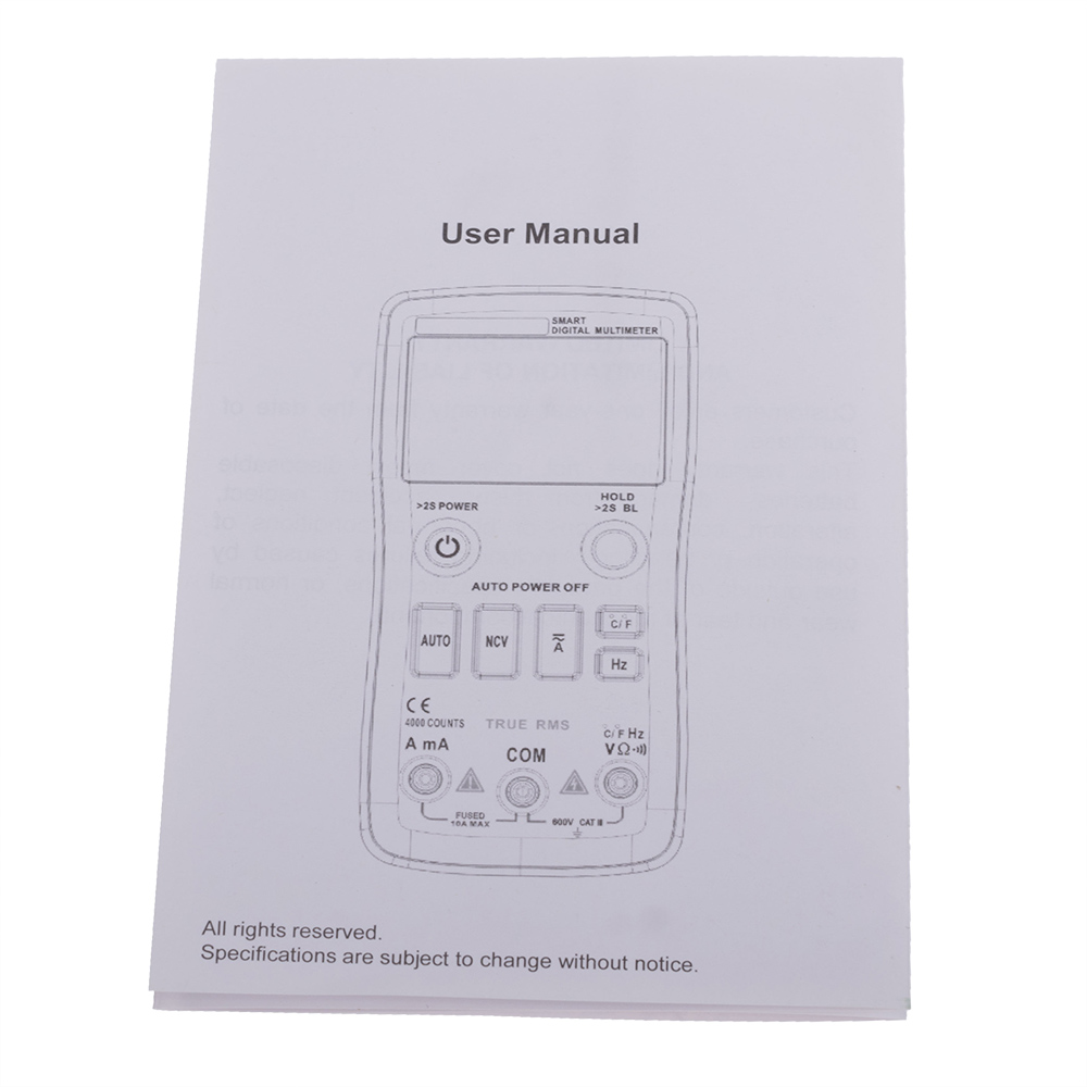 Опис: Цифровий мультиметр True RMS. Розрядність шкали мультиметра: 6000 відліків. Постійна напруга: 600m / 6/60/600 / 1000V: ± 0.5%, змінна напруга: 600m / 6/60/600/750: ± 1.0%, постійний струм: 600μ / 60m / 600m / 10A: ± 1.5%, змінний струм: 600μ / 60m / 600m / 10A: ± 1.5%, опір: 600 / 6K / 60K / 600K / 6M: ± 0.5% / 60M: ± 1.5%, вимір ємності: 10nF / 100nF / 1uF / 10uF / 100uF: ± 5,0% / 1000uF / 10000uF: ± 5,0%, вимірювання частоти: 5Hz-10Mhz. Прозвонка з'єднань, діодний тест, підсвічування. Живлення: 2XAAA