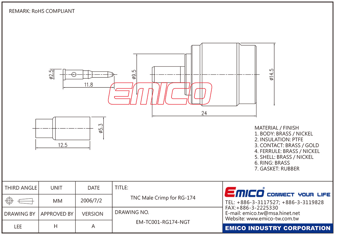 Продукція > Роз'єми, клеми, з'єднувачі > ВЧ роз'єми та перехідники > TNC-вилка на кабель (EM-TC001-RG58-NGT) Emico