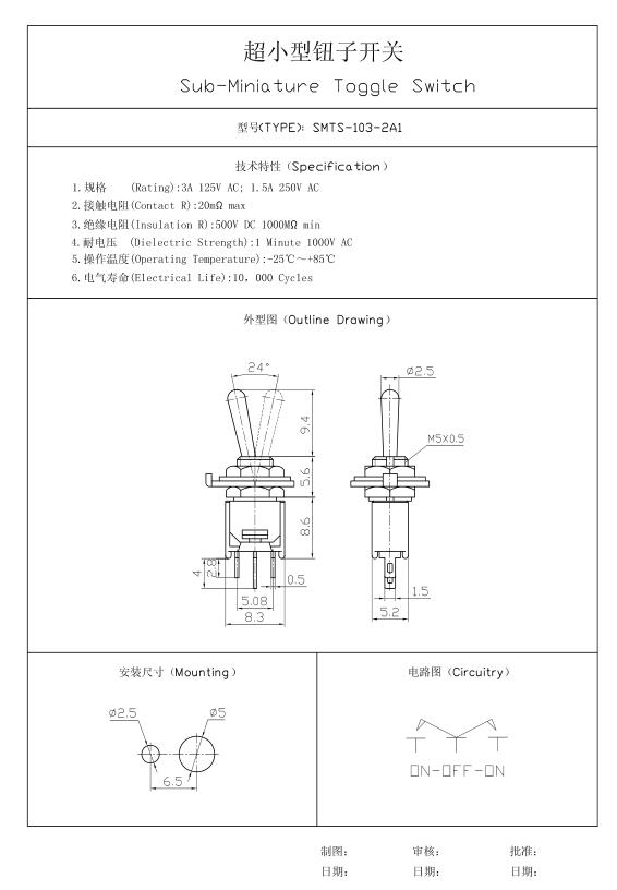 single pole; solder terminals; ON-OFF-ON; SPDT; 3P; 3A; 125V; 1.5A; 250V SMTS103-2A1; toggle switch; PRZ Smts1032a1 кількість в упаковці: 50 шт |
