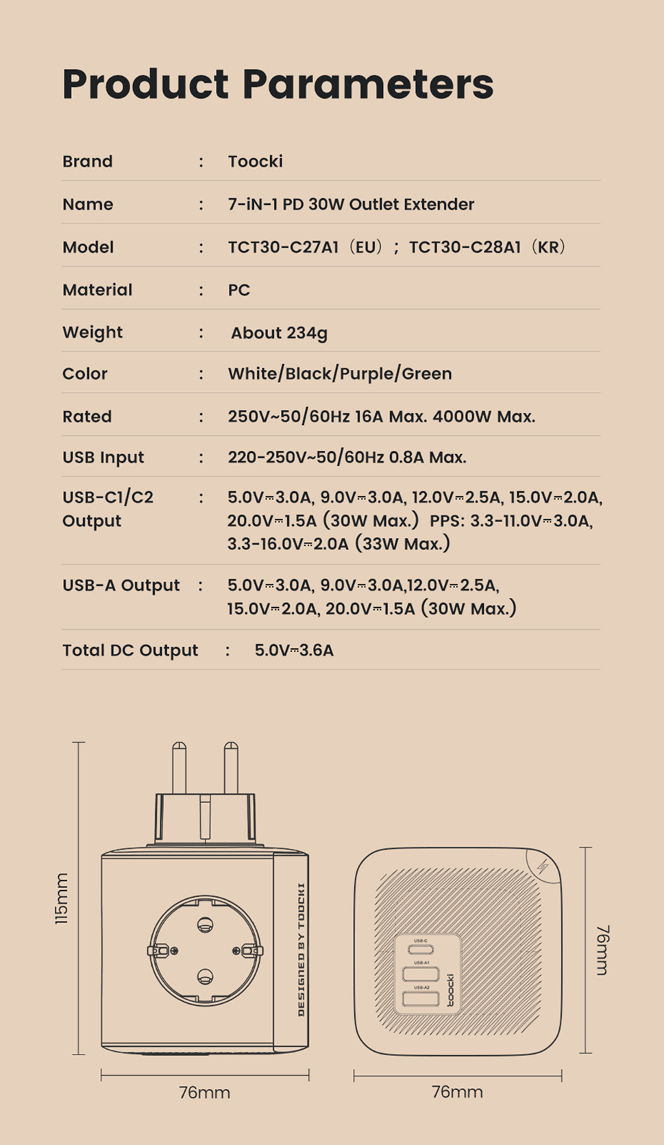 Опис: Мережевий розгалужувач 7-в-1 PD 30W. Вхід/3 вихода мережевих 250V~50/60Hz струм 16AMax (загальний на весь пристрій) 4000W Max. USB вхід 220…250V~50/60Hz 0.8A Max. Виходи USB-C1/C2: 5V/3A, 9V/3A, 12V/2.5A, 15V/2A, 20V/1.5A (30W Max), PPS 3.3…11V/3A, 3.3…16V/2A (33W Max). USB-A: 5V/3A, 9V/3A, 12V/2.5A, 15V/2A, 20V/1.5A (30W Max). Габарити 76x76x115mm, вага ~234g. Матеріал PC.