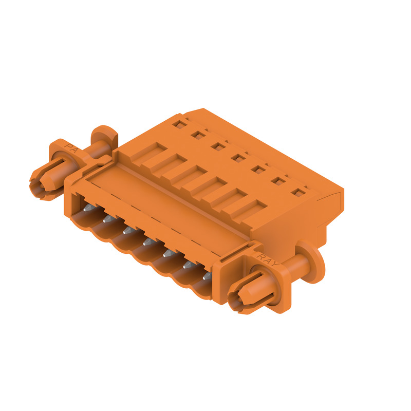 Description: CONNECTOR 5.00 MMPackaging: Bulk Features: Ejector Latches, Retention Latches (Wire Side) Color: Orange Mounting Type: Free Hanging (In-Line) Number of Positions: 6 Pitch: 0.197" (5.00mm) Type: Plug, Female Sockets Operating Temperature: -50°C ~ 100°C Termination Style: Screwless - Leg Spring, Push-In Spring Current - IEC: 24A Number of Levels: 1 Wire Gauge or Range - AWG: 12-26 AWG Wire Gauge or Range - mm²: 0.2-2.5mm² Positions Per Level: 6 Plug Wire Entry: 90° Contact Mating Finish: Tin Current - UL: 18.5 A Voltage - IEC: 400 V Voltage - UL: 300 V |