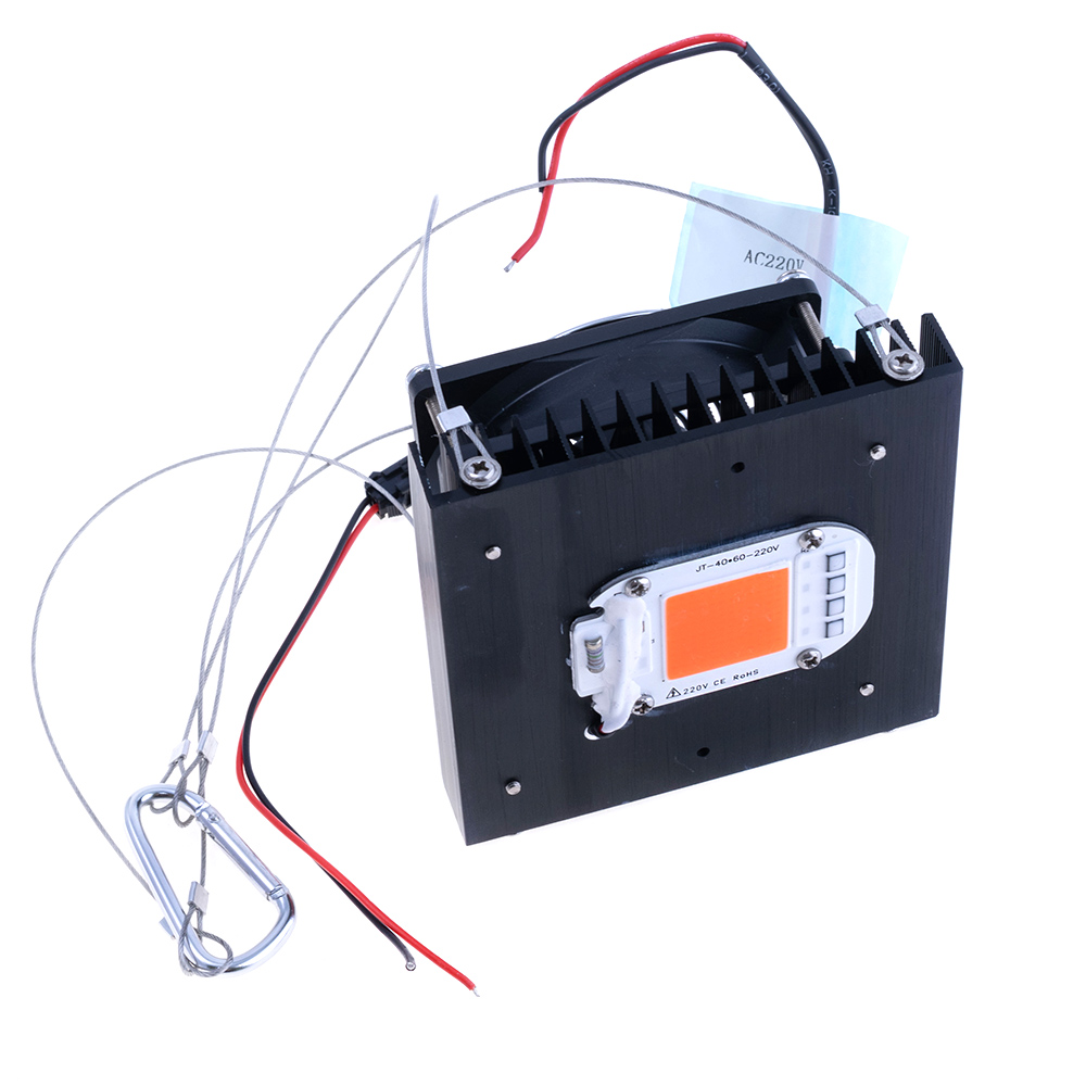 Світлодіоди > Фітосвітлодіоди Спектр: Радіатор + 2 потужних 50W COB світлодіода, з активним охолодженням. Живлення: 220VAC. Габарити: 200x100x51mm |